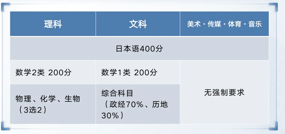 EJU日本留学生考试,非日籍学生必考,一年两次机会。文、理、艺体分科,最高分成绩单,提交大学。