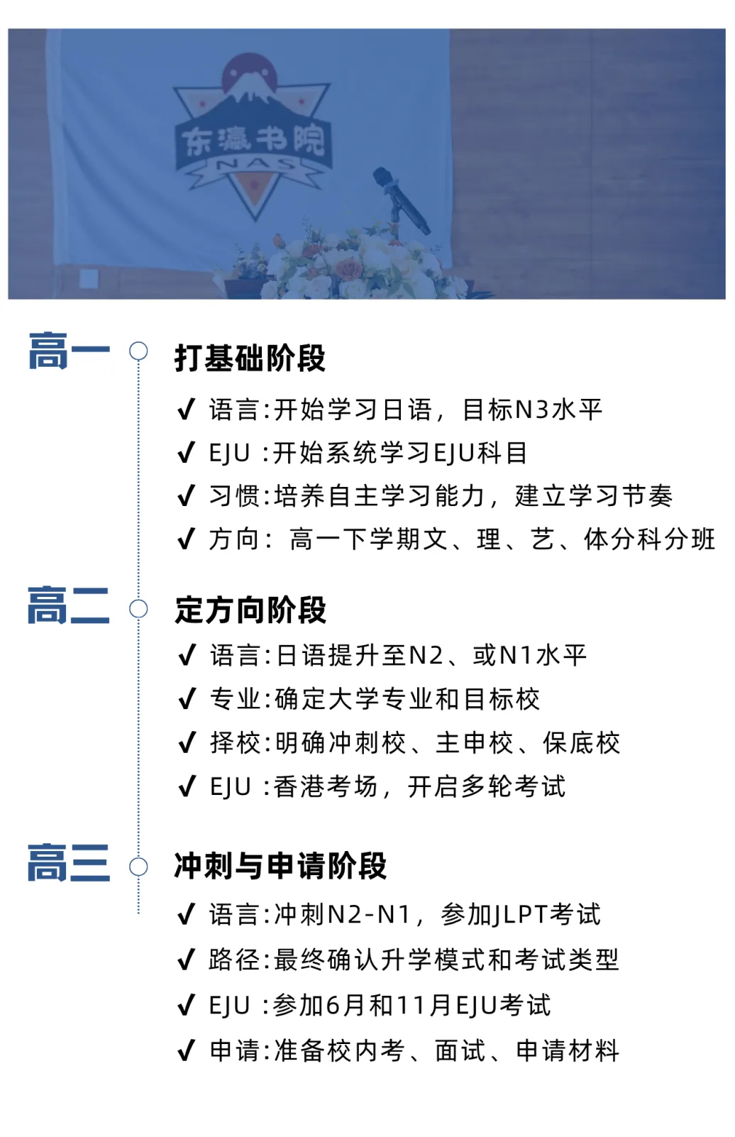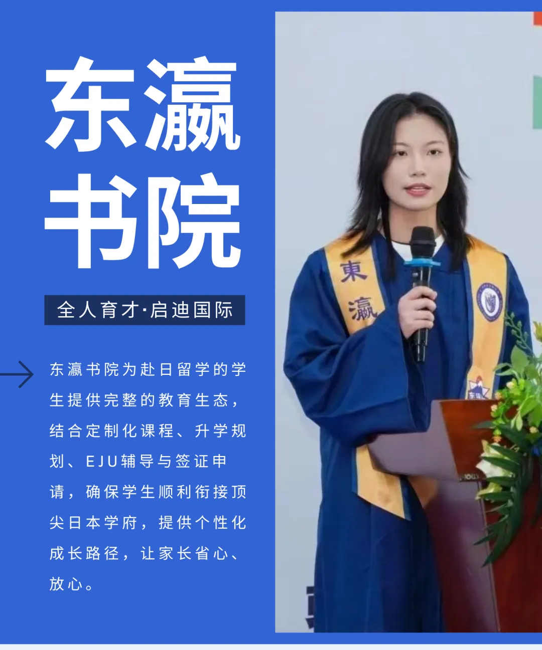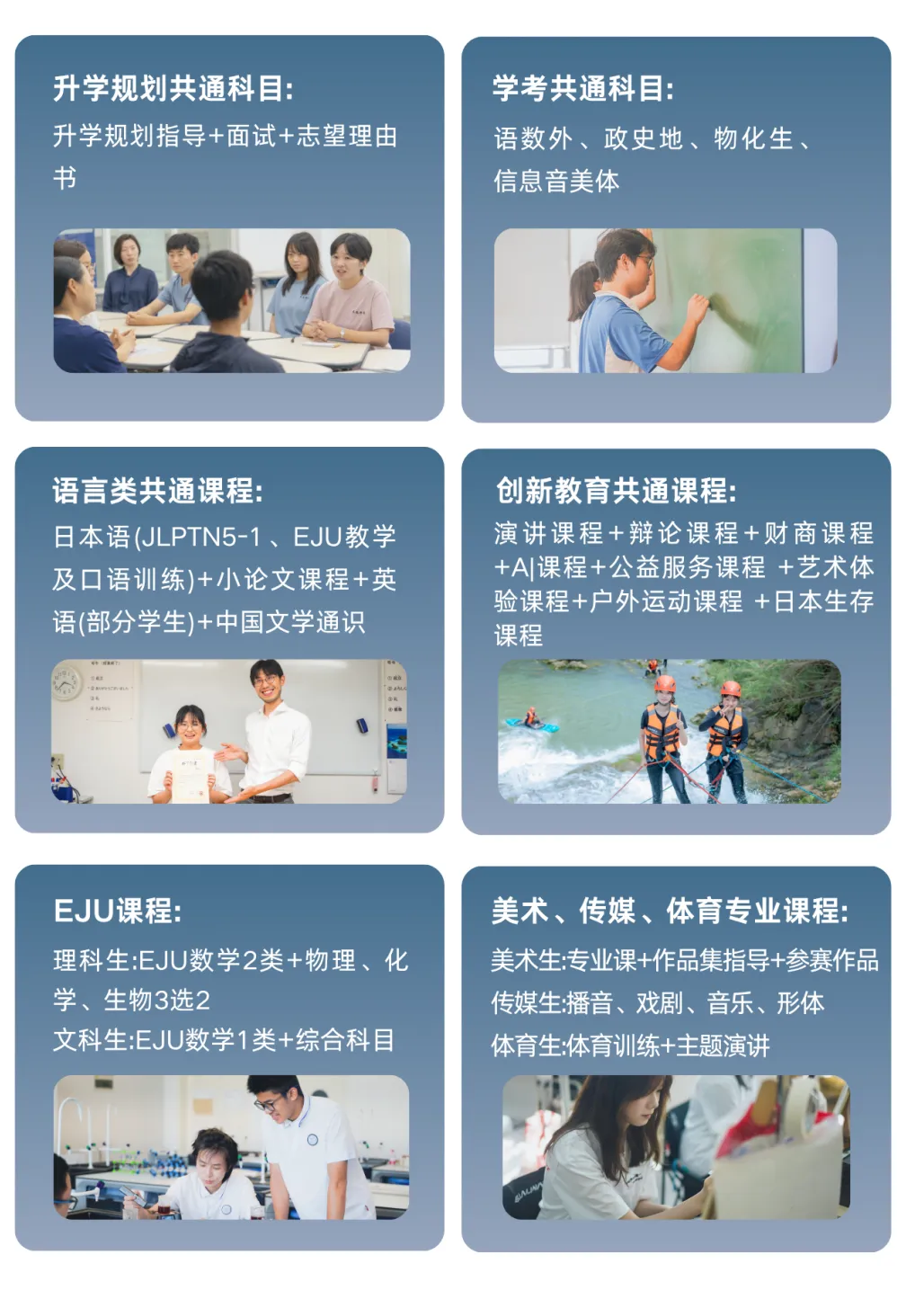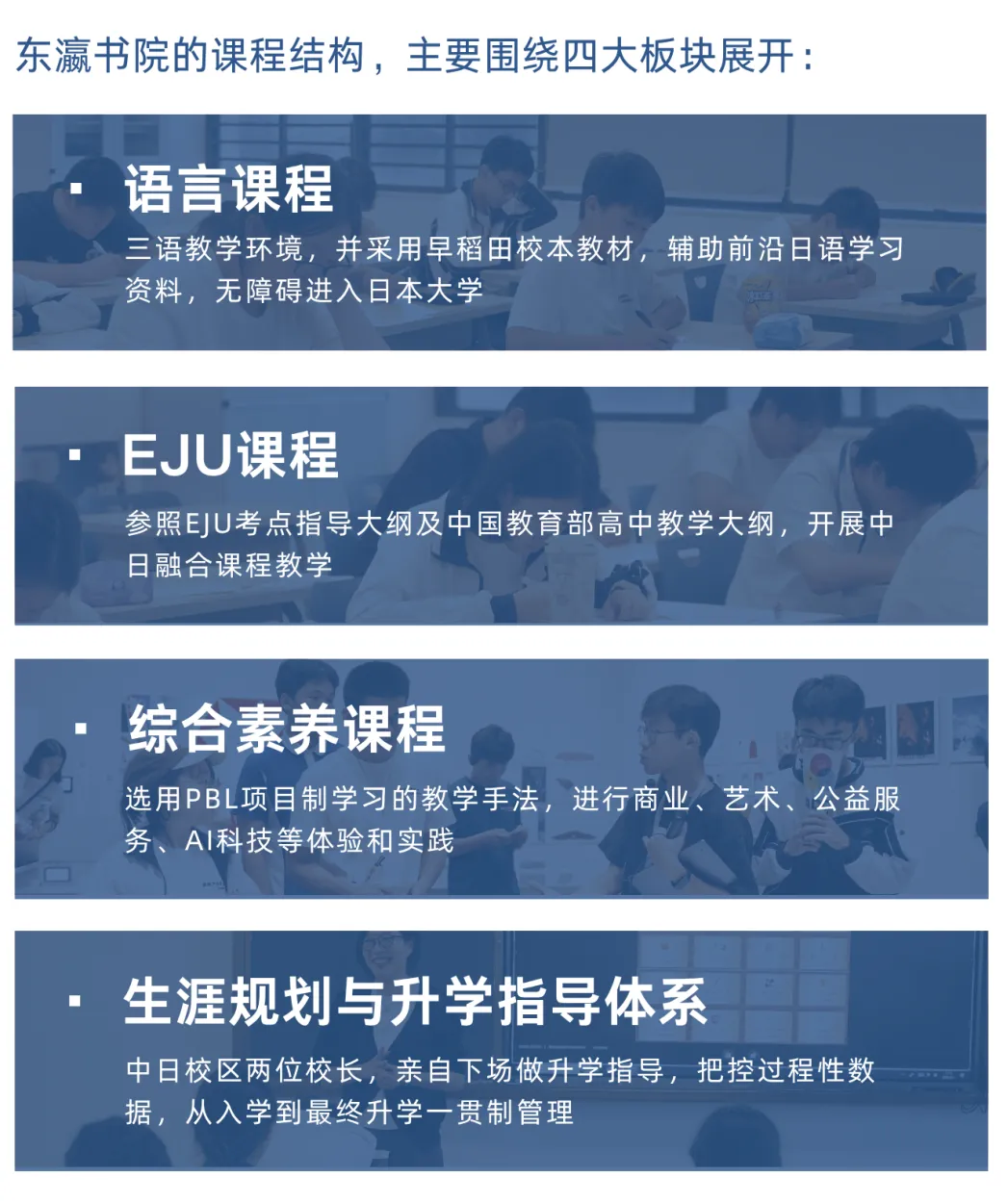东瀛书院隶属于深圳市中新中学,为志向考入日本大学的学生,提供高中阶段的EJU、JLPT、大学校内考、英语、及综合素养课程,并全程提供志望理由书、小论文、大学面试、择校择专业等升学规划与指导服务,以及全流程保姆式的留学资格、海外签证、租房等留学申请服务。从高一入学,到最终考入日本大学,为同一团队的一贯制管理,真正意义上,做到为最终结果负责。