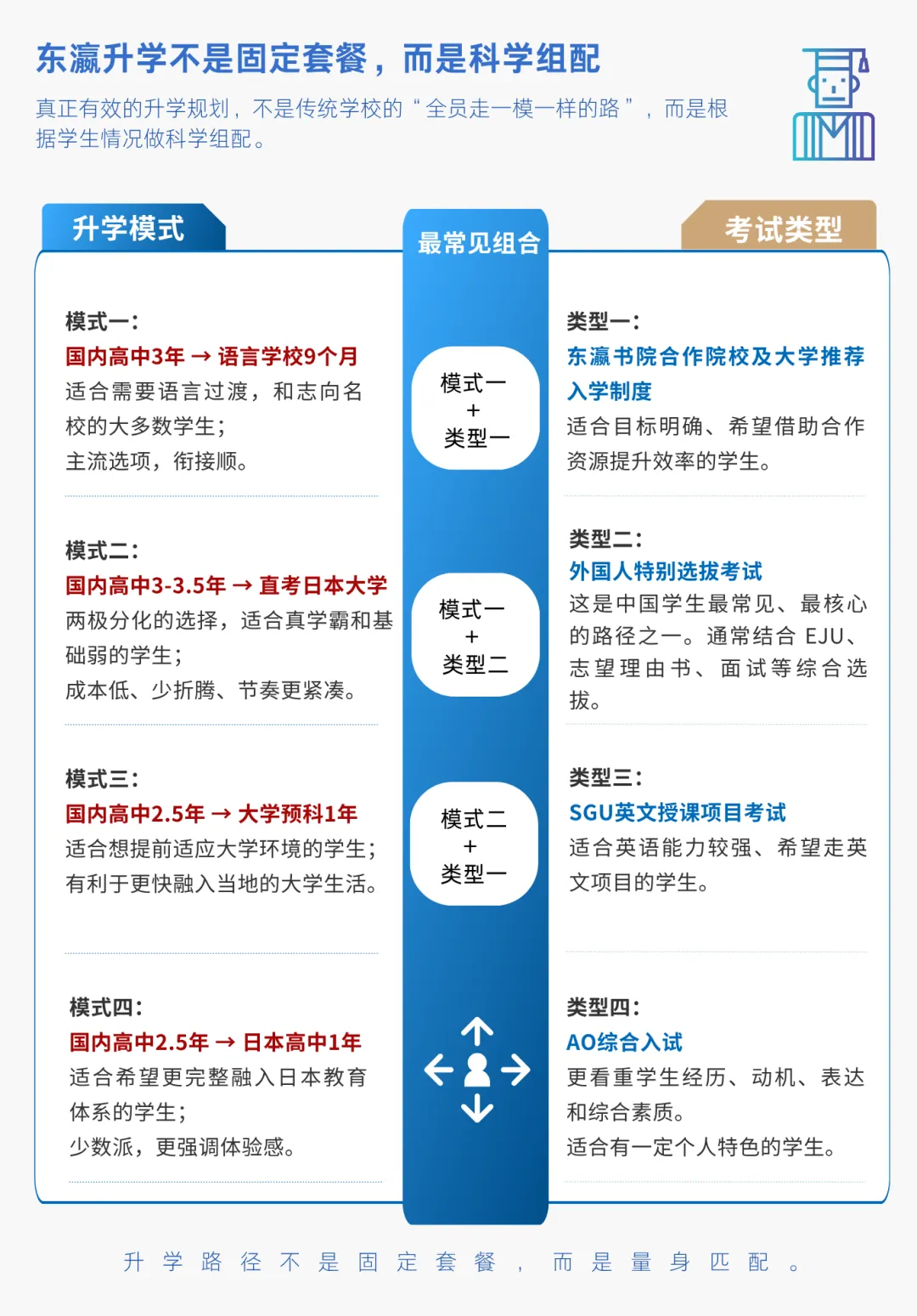 真正有效的升学规划,不能“全员走一模一样的路”,而是根据学生情况做科学组配。东瀛书院囊括了市面上常见的所有升学模式,为学生的每一种选择,提供专业支持。