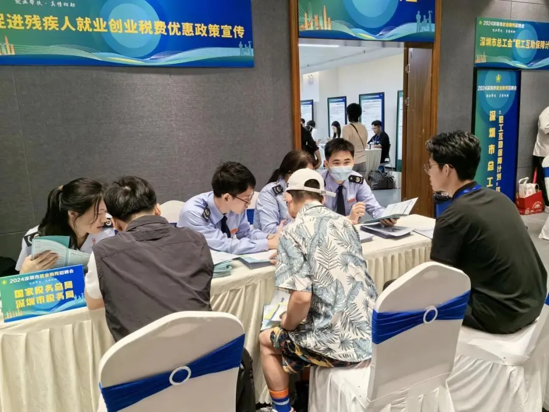 招聘会现场,“税惠助残”政策宣传专区吸引了众多企业和残疾人士驻足。为保障此次招聘会的税务咨询需求,深圳税务部门派出业务骨干组建“爱心服务保障团队”,在现场为参会企业和残疾人“一对一”“手把手”开展政策宣传、培训辅导,深入解读助残扶残税费优惠政策。“税务部门的辅导很专业,真是一场及时雨。”安徽一宸人力资源管理有限公司深圳分公司财务人员李女士连声赞道。