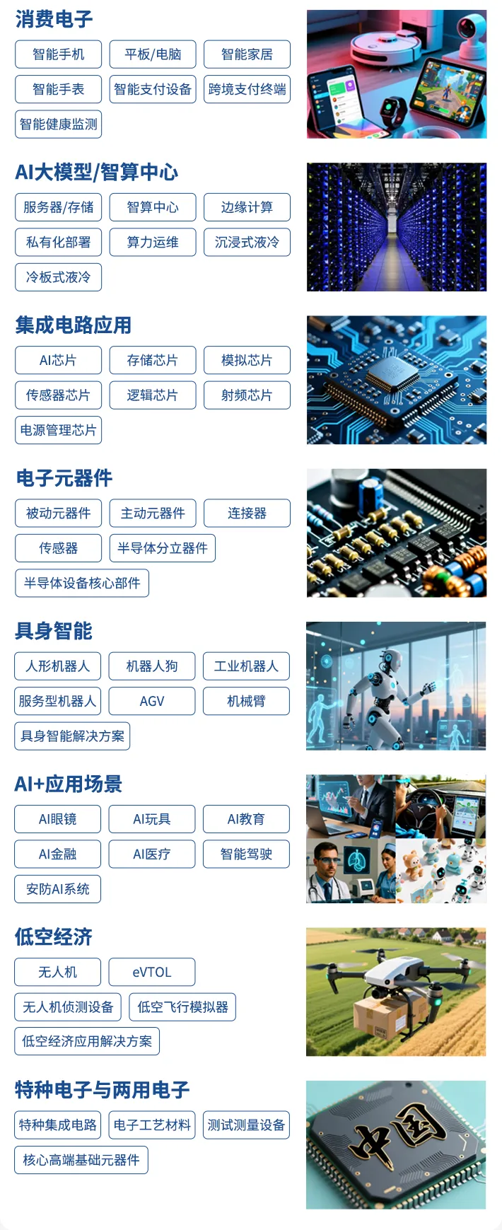 从底层核心硬件到上层场景应用,一幅由前沿技术构筑的电子信息产业全景图正徐徐展开,覆盖消费电子、具身智能、AI大模型与智算中心、集成电路、电子元器件、特种电子等全产业链领域。