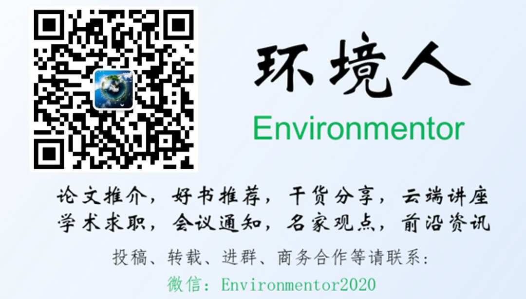 投稿:清华大学深圳国际研究生院陶益副教授课题组;转载请勿改动格式并在文首注明来源。投稿、合作、转载、进群,请添加小编微信Environmentor2020!环境人Environmentor是环境领域最大的学术公号,拥有25W+活跃读者。由于微信修改了推送规则,请大家将环境人Environmentor加为星标,或每次看完后点击页面下端的“在看”,这样可以第一时间收到我们每日的推文!环境人Environmentor现有综合群、期刊投稿群、基金申请群、留学申请群、各研究领域群等共20余个,欢迎大家加小编微信Environmentor2020,我们会尽快拉您进入对应的群。