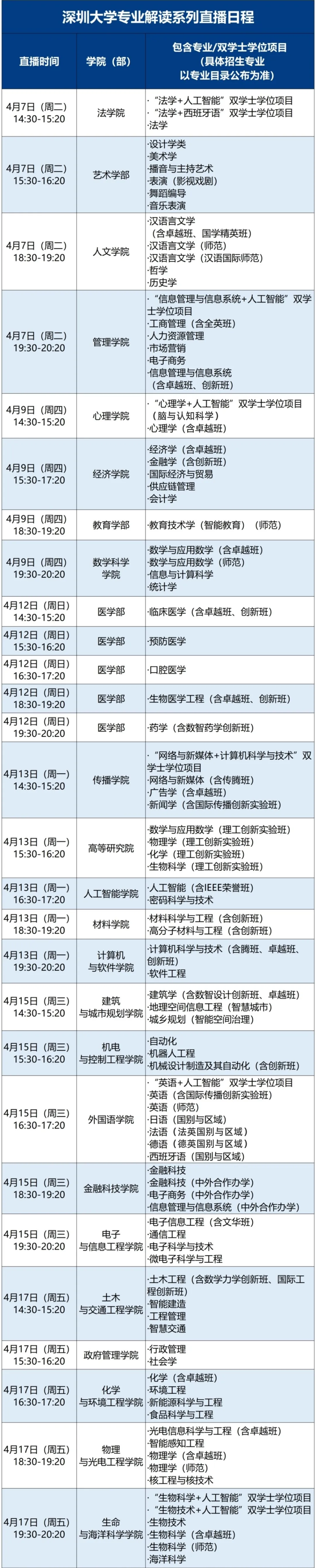 4月7日—4月17日深圳大学专业解读系列直播开播持续带你从多个视角深入领略深大深厚的学术底蕴创新的发展活力以及卓越的人才培养体系精准助力你的专业抉择与未来学业规划
