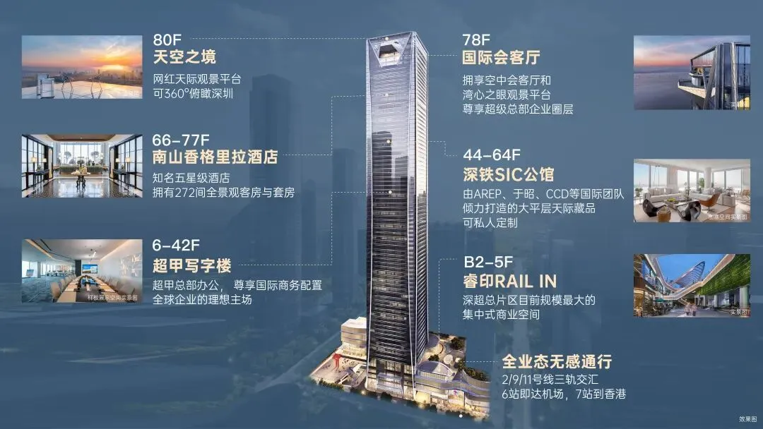 ✨全维配套:建筑面积约𝟏𝟎万㎡睿印RAIL IN、南山香格里拉酒店、深铁SIC公馆、国际会客厅、天空之境