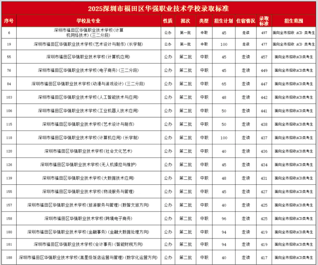 深圳市福田区华强职业技术学校创办于1986年,是福田区属唯一一所公办职校,三个校区均地处深圳中心城区,面向全市招收初中毕业生。华强职校是国家重点中职学校、国家示范校中职学校、广东省首批高水平中职学校建设单位、世界技能大赛深圳集训基地,曾入选中国职业教育百强校。
