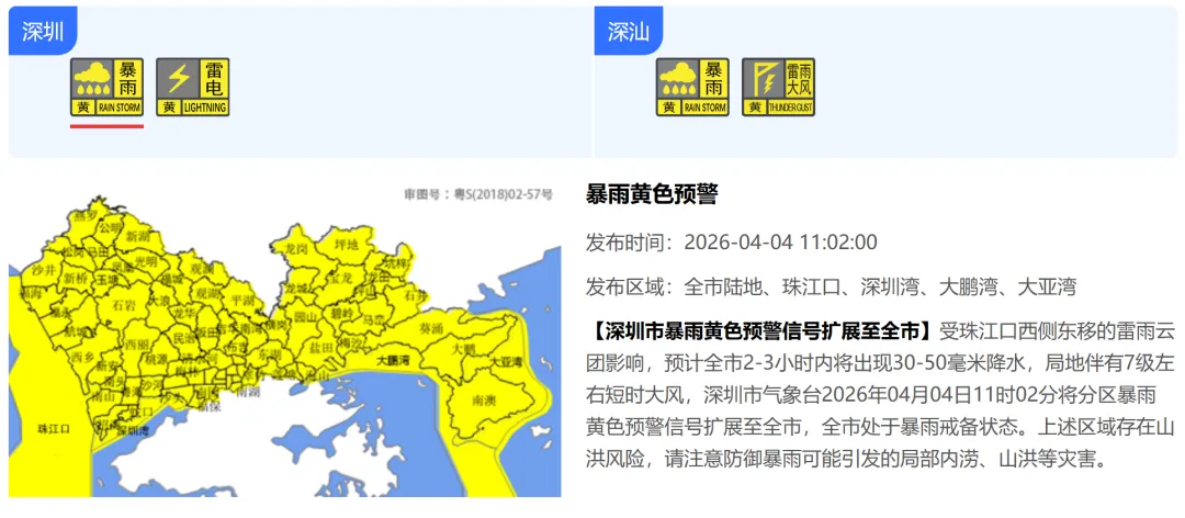 【深圳市暴雨黄色预警信号扩展至全市】受珠江口西侧东移的雷雨云团影响,预计全市2-3小时内将出现30-50毫米降水,局地伴有7级左右短时大风,深圳市气象台2026年04月04日11时02分将分区暴雨黄色预警信号扩展至全市,全市处于暴雨戒备状态。上述区域存在山洪风险,请注意防御暴雨可能引发的局部内涝、山洪等灾害。