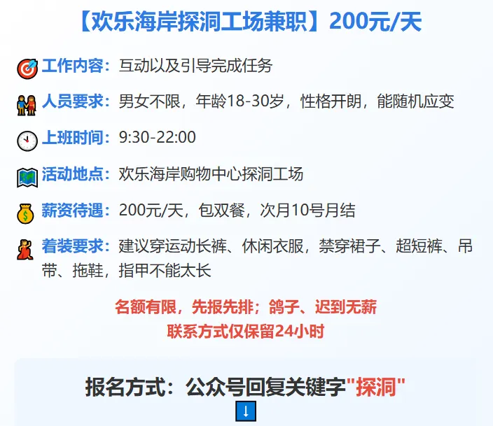 >【深圳兼职】欢乐海岸·探洞工场兼职丨200元/天,跟小朋友互动、引导其完成游玩任务,男女不限,年龄18-30岁,性格开朗,能随机应变.