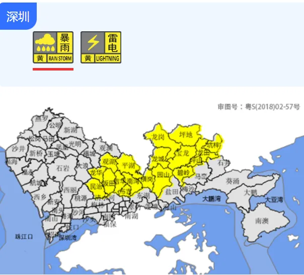 过去2小时,龙岗区(布吉、坂田、南湾、平湖、吉华街道)和龙华区(龙华、民治、观湖街道)已出现较明显降雨,预计未来2-3小时内还将出现20-30毫米降水,深圳市气象台2026年04月04日10时22分将分区暴雨黄色预警信号扩展至上述区域,并发布全市雷电预警信号。市民停留在安全地方。全市处于暴雨戒备状态。上述区域存在山洪风险,请注意防御暴雨可能引发的局部内涝、山洪等灾害。