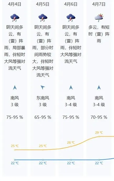 4月4日有(雷)阵雨,局部有暴雨,并伴有8级或以上雷雨大风等强对流天气;