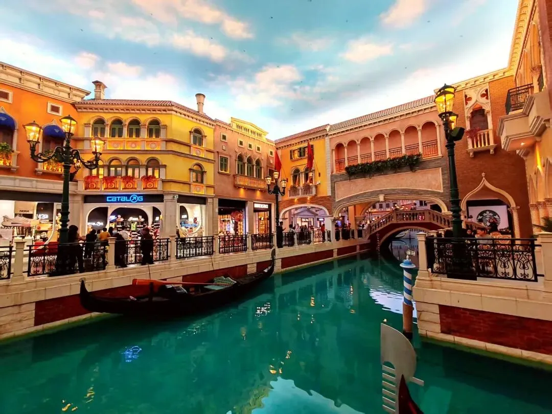 以美国拉斯维加斯威尼斯创意为主题的 【威尼斯人度假城】以威尼斯水乡为主题,酒店周围内充满威尼斯特色拱桥、运河及石板路,这里有着世 界最壮观的室内蓝天白云,夜间繁星密布,感受威尼斯人浪漫狂放的异国风情。
