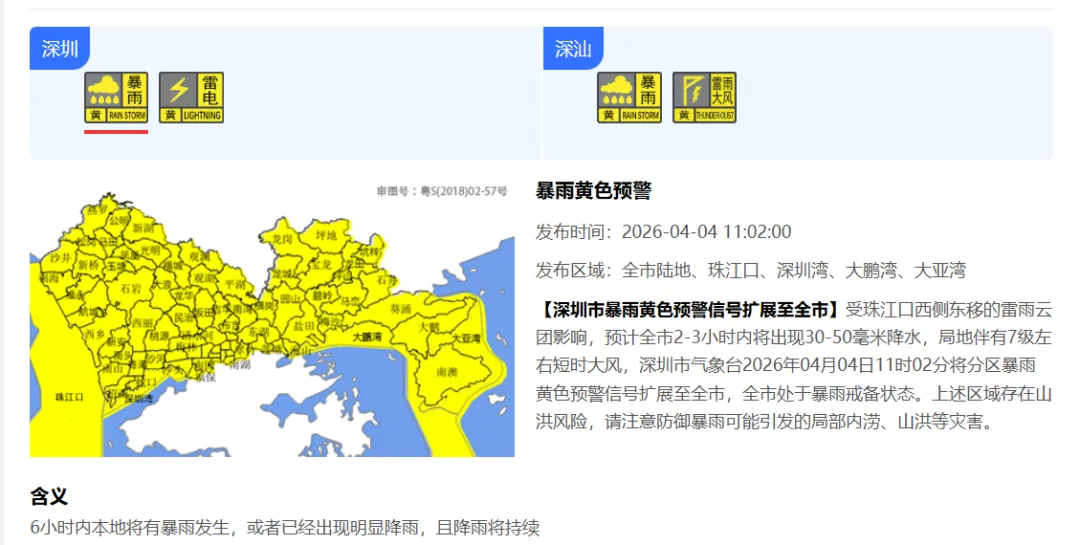 【深圳市暴雨黄色预警信号扩展至全市】受珠江口西侧东移的雷雨云团影响,预计全市2-3小时内将出现30-50毫米降水,局地伴有7级左右短时大风,深圳市气象台2026年04月04日11时02分将分区暴雨黄色预警信号扩展至全市,全市处于暴雨戒备状态。上述区域存在山洪风险,请注意防御暴雨可能引发的局部内涝、山洪等灾害。