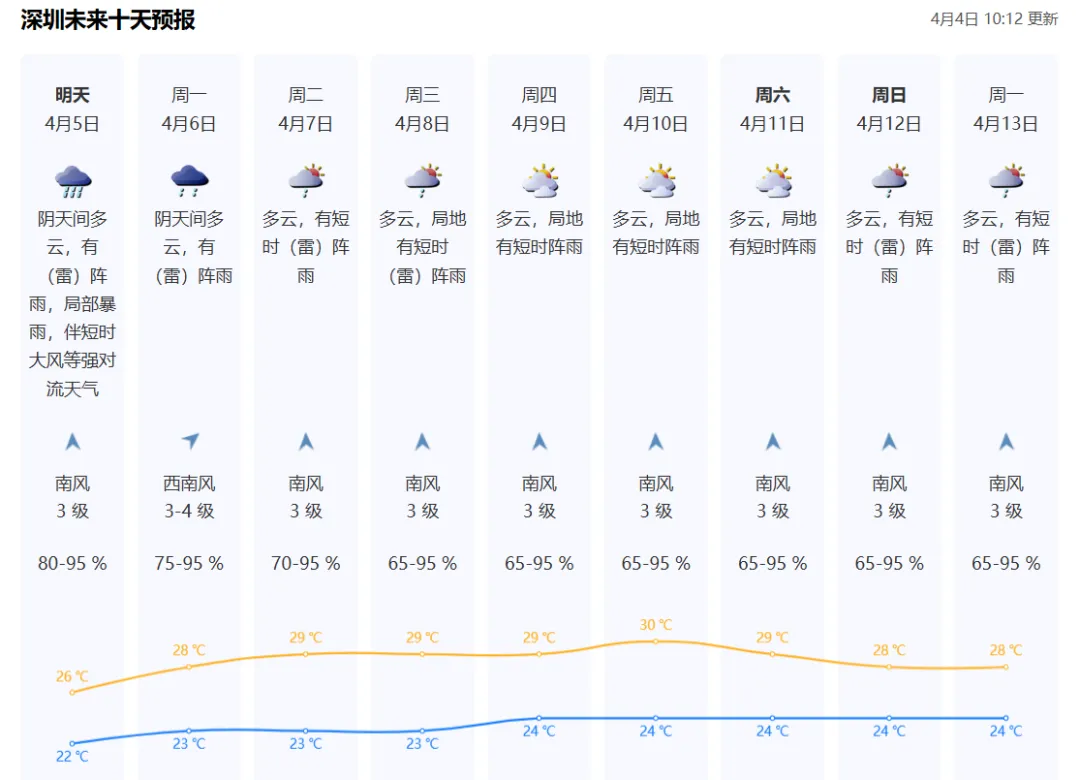 4日阴天,有雷阵雨,局部暴雨,雨时伴有8级或以上短时大风等强对流天气,气温22℃-25℃;5-6日降雨频密,局部暴雨风险高,间中有8级左右短时大风;展望7-9日,多云为主,气温上升,天气转热。清明假期天气不稳定,雷雨影响期间伴有短时大风,请大家注意妥善安置临窗和阳台物品,谨防高空坠物;加固临时搭建物,注意远离广告牌、大树、危旧建筑等区域;滨海旅游、海上作业和户外高空活动注意防风。