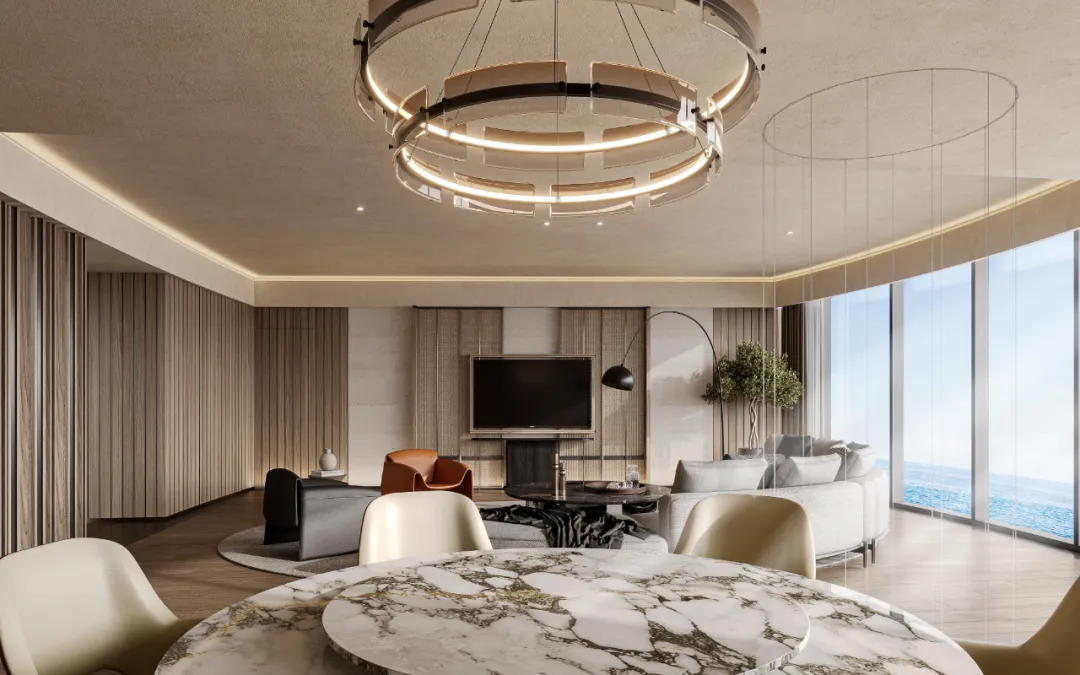经典的弧线经现代手法转译,米白与浅咖的温润色调,弱化了建筑的体量感