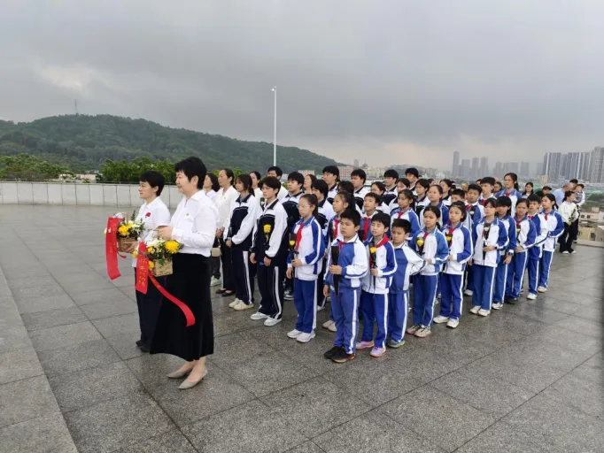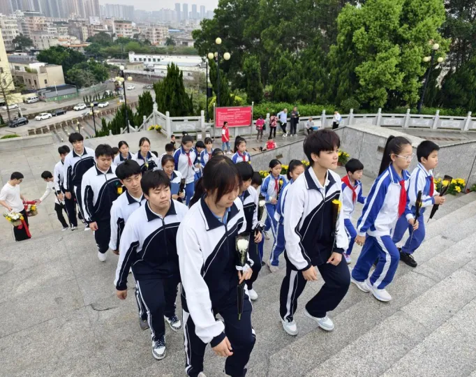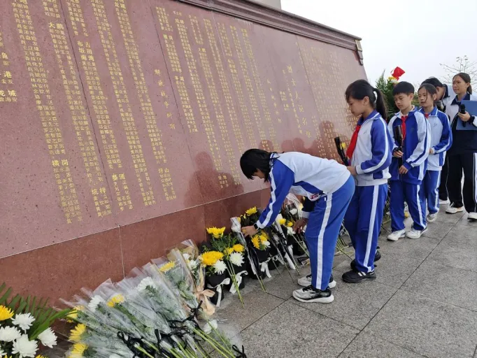宣誓结束后,举行了简朴而庄重的敬献仪式。校领导代表学校向革命烈士纪念碑敬献花篮,并仔细整理缎带。随后,全体师生手持鲜花,依次缓步上前,将一朵朵寄托着哀思与敬意的鲜花敬献在碑前。