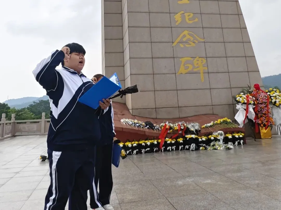 进入庄严的学生宣誓环节,在学生代表卢绍溪同学的领誓下,全体师生举起右手,面向纪念碑,用铿锵有力的声音庄严宣誓:铭记先烈遗志,传承红色精神;坚定理想信念,勇担时代使命;以先烈为榜样,勇敢无畏、百折不挠,为实现中华民族伟大复兴贡献力量!”