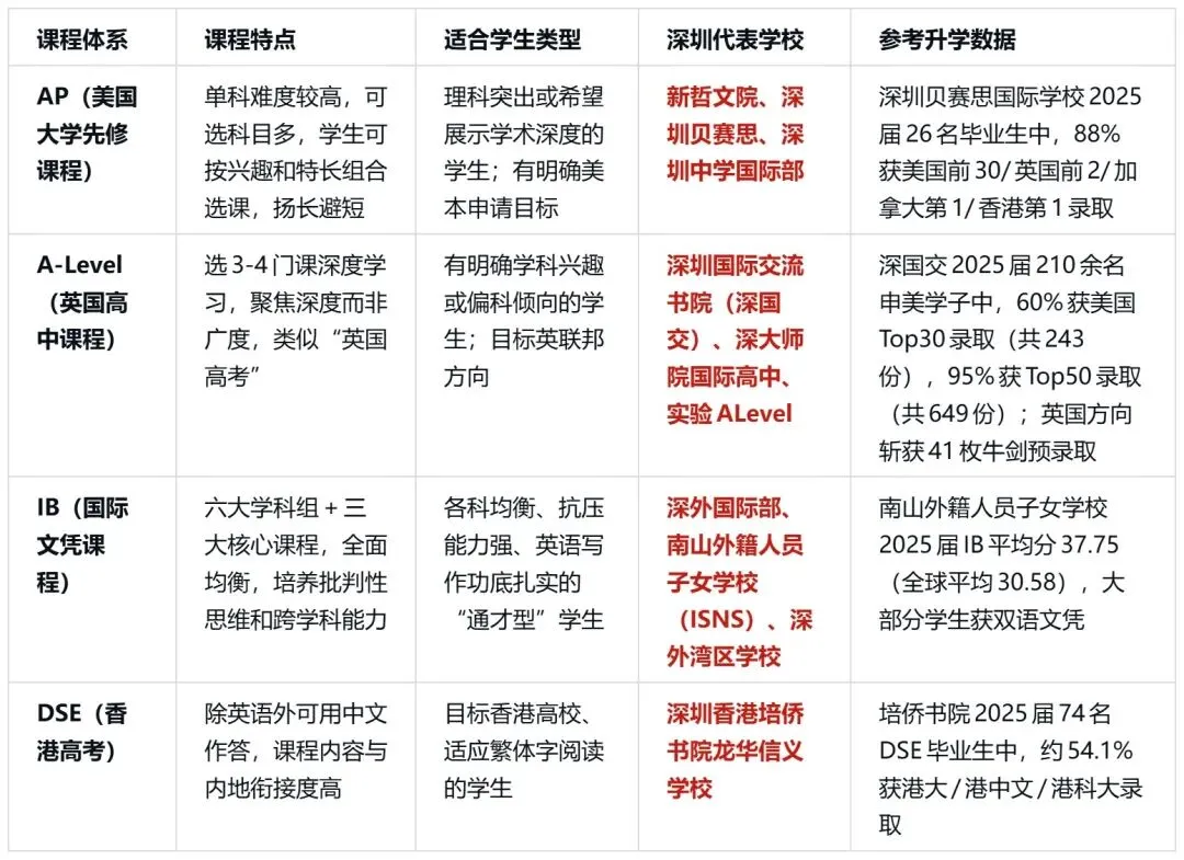 深圳作为大湾区国际教育资源最集中的城市之一,已形成从小学到高中的完整国际教育链条。目前全市有数十所国际化学校/项目,涵盖AP、A-Level、IB、DSE等主流课程体系。每一种课程体系都有其最适合的学生群体,没有绝对的“最好”,只有“最匹配”。