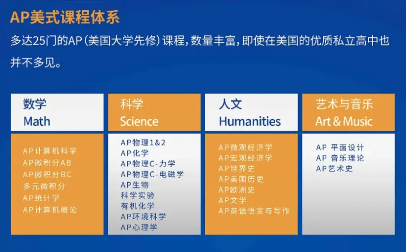 新哲文院是美国大学理事会认证的AP学校,高中阶段开设了25门AP课程,涵盖微积分、统计、计算机、物理、化学、生物、经济学、心理学、艺术史等,数量之丰富,即使在美国优质私立高中也并不多见。学生可以真正实现“文理兼修、扬长避短”——数学强的学生可以选AP微积分BC、统计,计算机感兴趣的学生可选AP CSA,文科特长的学生可选AP英语语言、AP心理学、AP艺术史。