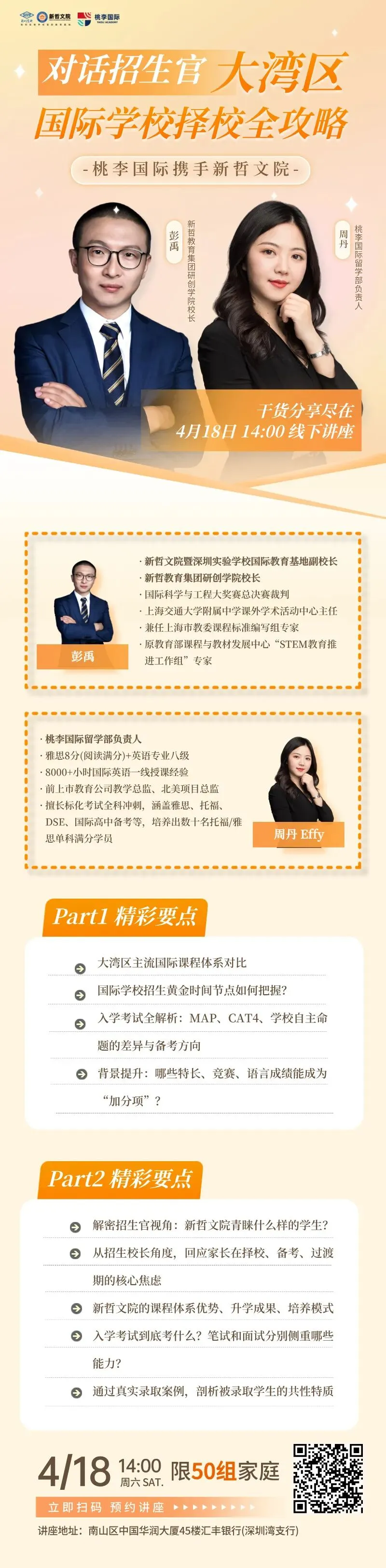 4月18日(周六)下午14:00 ,桃李国际携手新哲文院,在南山区中国华润大厦45楼汇丰银行(深圳湾支行),举办一场仅限50组家庭的闭门讲座。