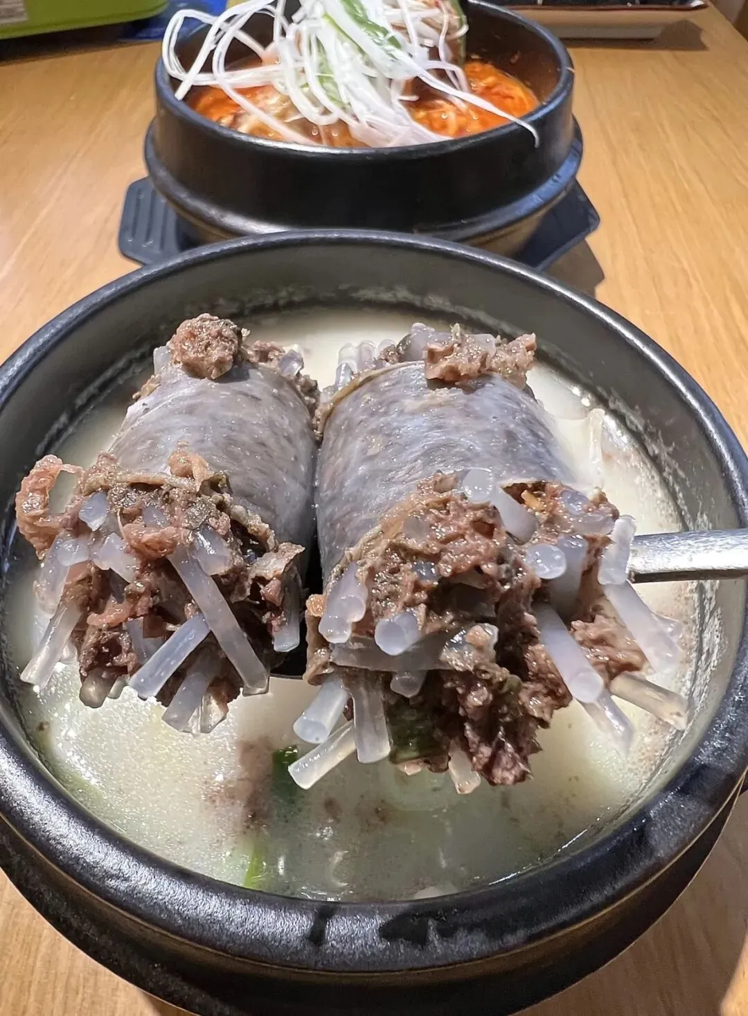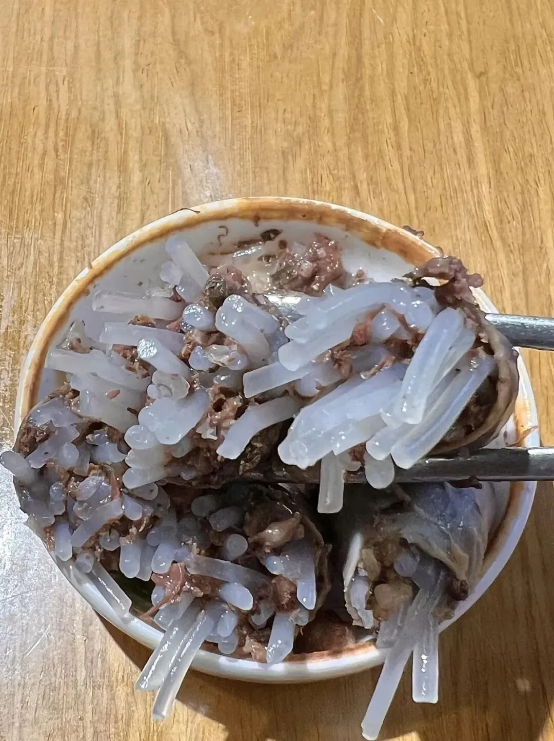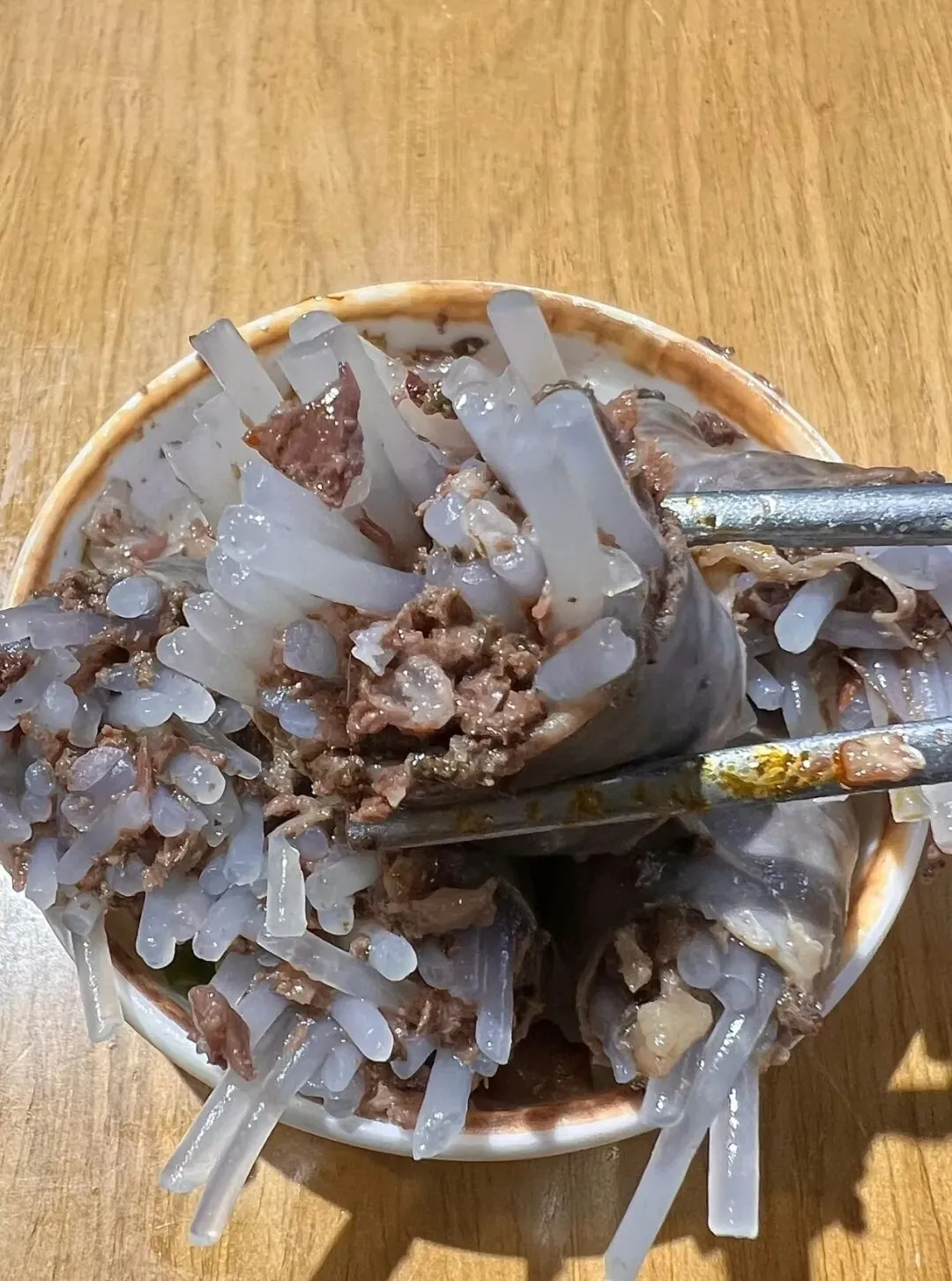 想问问广大的深圳网友,深圳这个到底是什么呀?是在一家普通的店里面吃到的,随便点的,也没认真看名字,结果吃起来真的非常好吃,外面的一根一根的,像粉丝一样的,不知道是什么东西,里面还包了肉,真的太香,太鲜了。