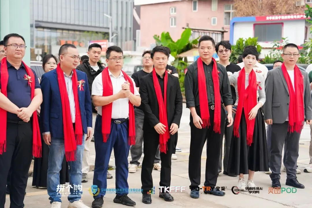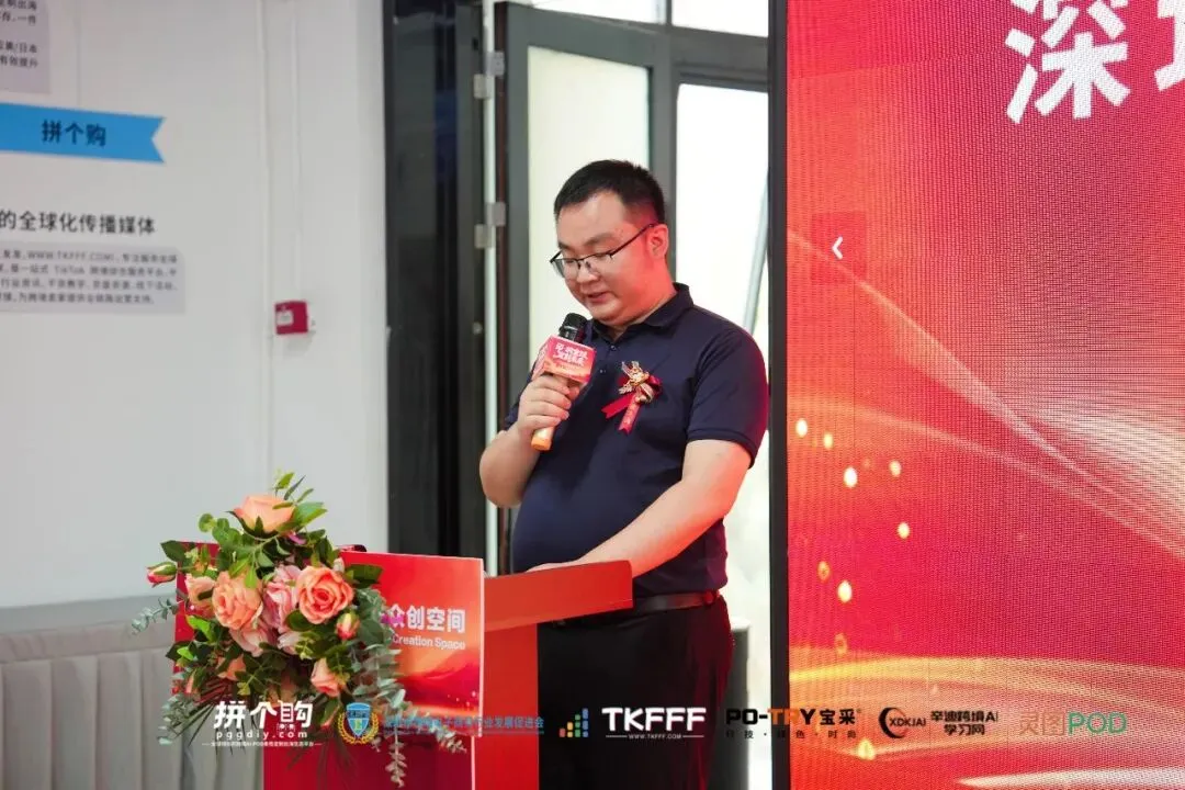 本次活动汇聚政校行企多方力量。深圳市跨境电子商务行业发展促进会会长徐元虎、拼个购大湾区POD生态众创空间负责人王丽昇、龙华区数字经济跨境电商产业园董事长翁锡贺、TikTok卖家门户网/TKFFF创始人樊晓刚、广东宝采智能科技有限公司联合创始人翁志伟、辛迪跨境AI学习网创始人辛迪、厦门灵图科技有限公司灵图 AI 市场商务负责人简影等嘉宾共同为空间揭牌和剪彩。