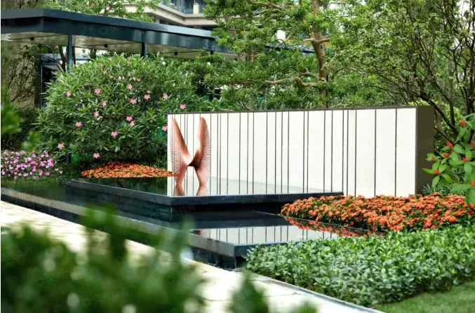 采用黄金麻石材打造约7.2米高入户门庭,步行台阶,近4m高差跌瀑水景,特设人性化无障碍通道及直梯,礼遇归家尊崇。