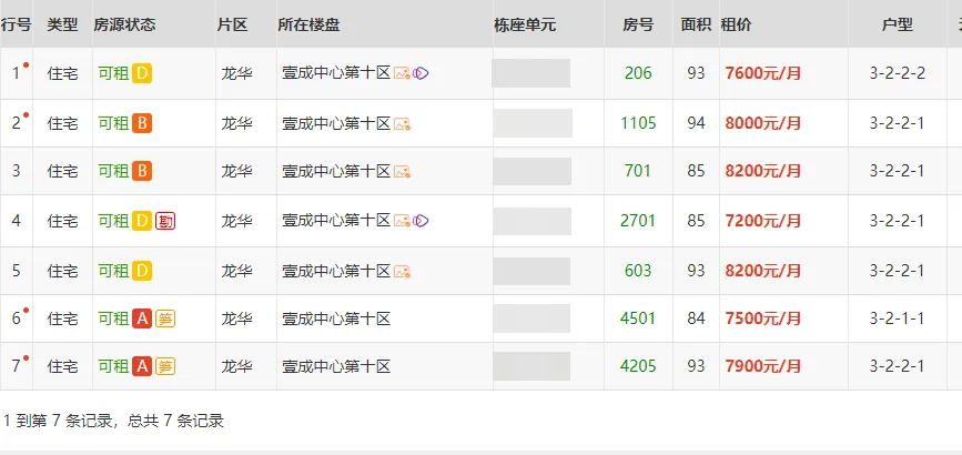 壹成十区房租价格基本上都是三房二厅二一厨卫价格在7000--8500元/月