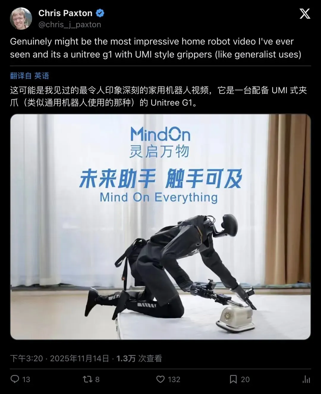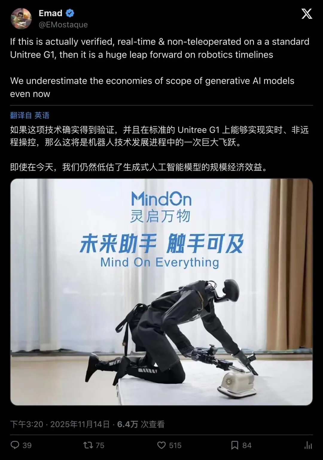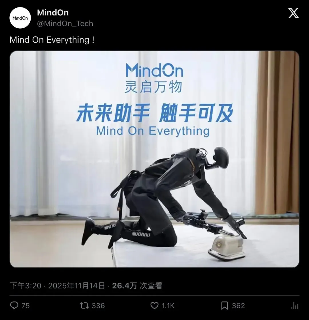 2025 年 11 月 14 日,一个叫 MindOn(灵启万物)的深圳初创公司,在 X(原 Twitter)上发了一条极其简短的帖子: