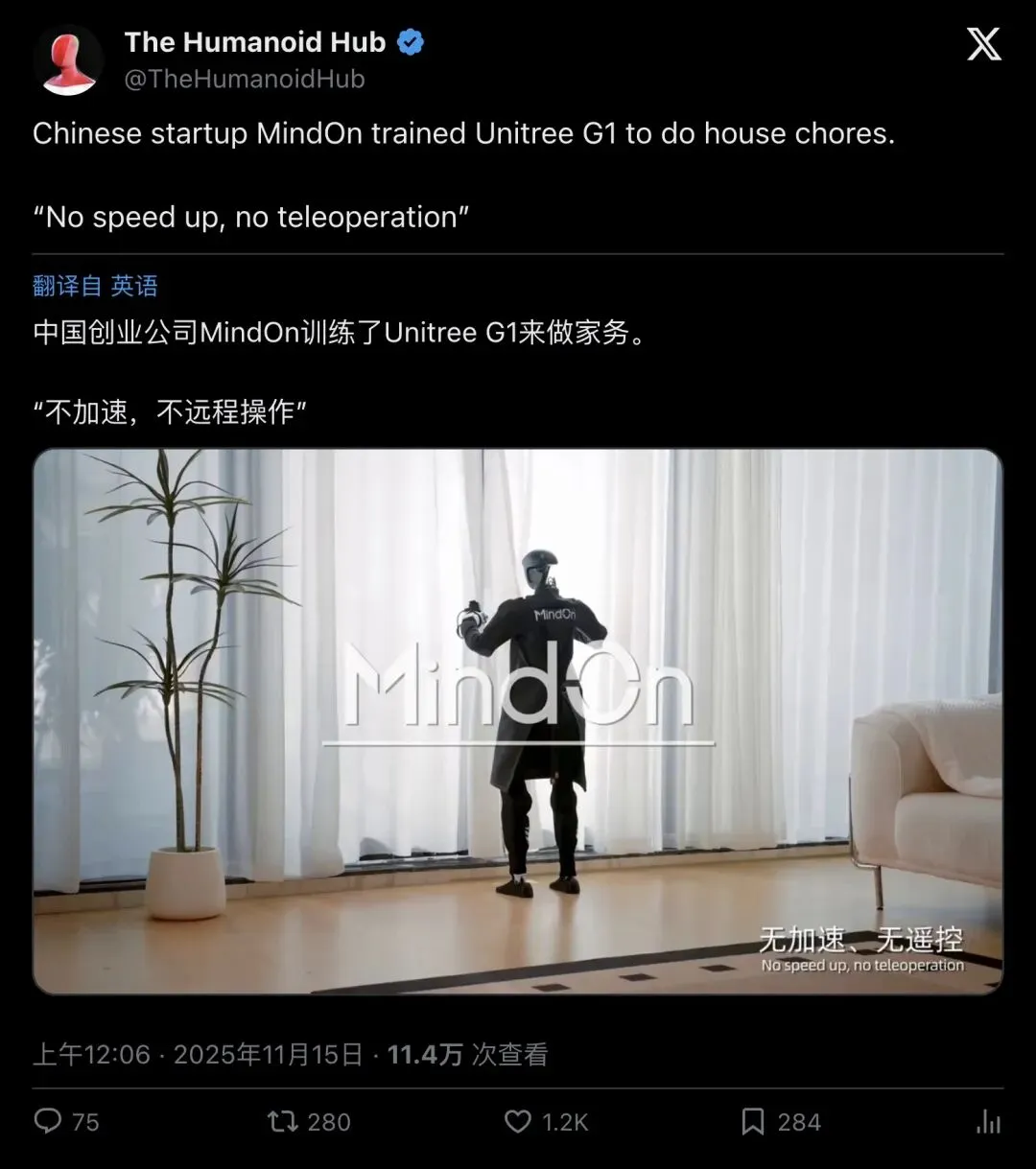 「中国初创公司 MindOn 训练 Unitree G1 做家务。不加速,不远程操控。」