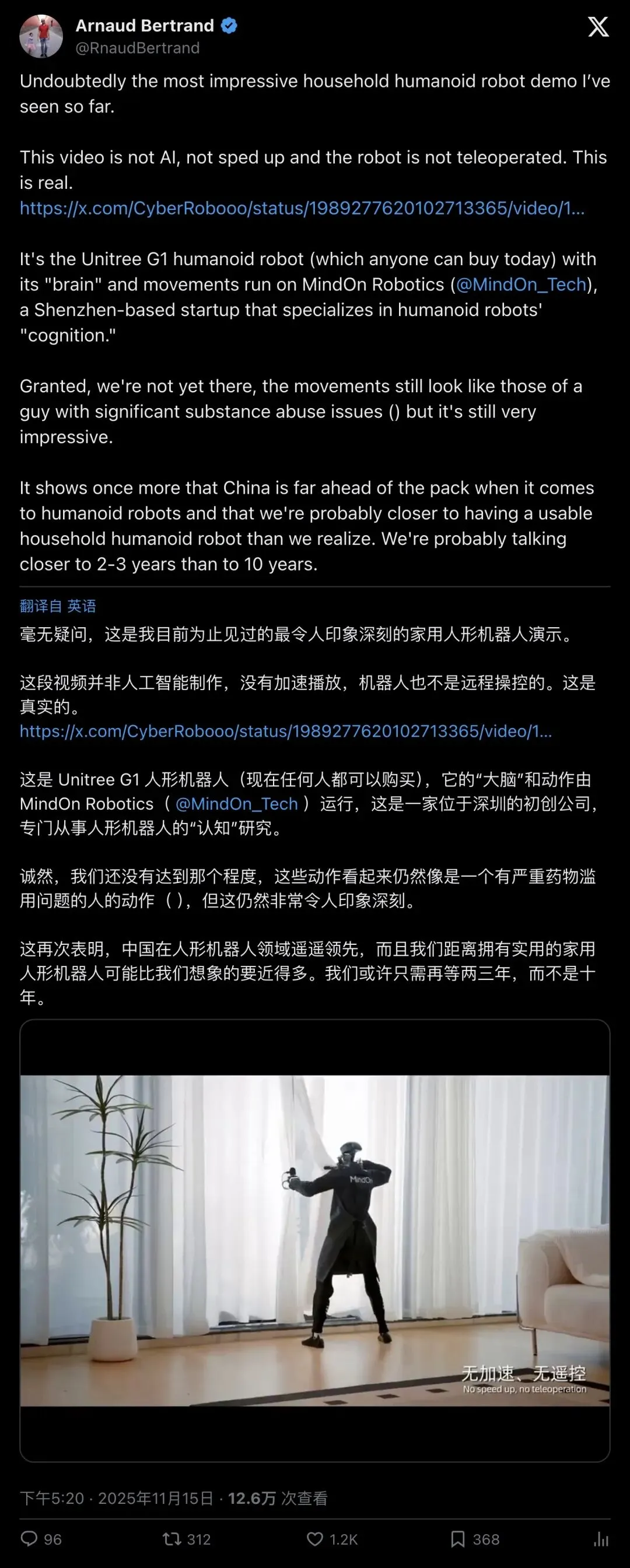 ▲ Arnaud Bertrand 长评——12.6 万次观看,1203 赞,"这可能是我见过最强的家用机器人 demo"