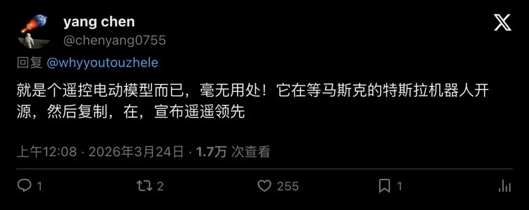 中文互联网上的质疑更加直白。一位名叫 @chenyang0755 的用户写道: