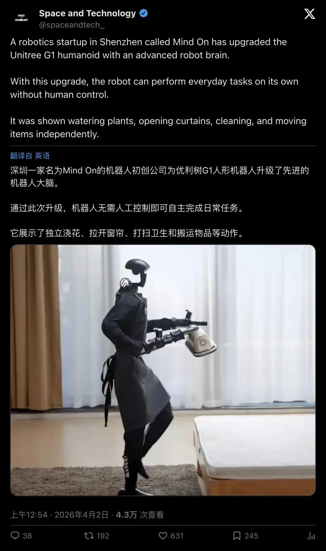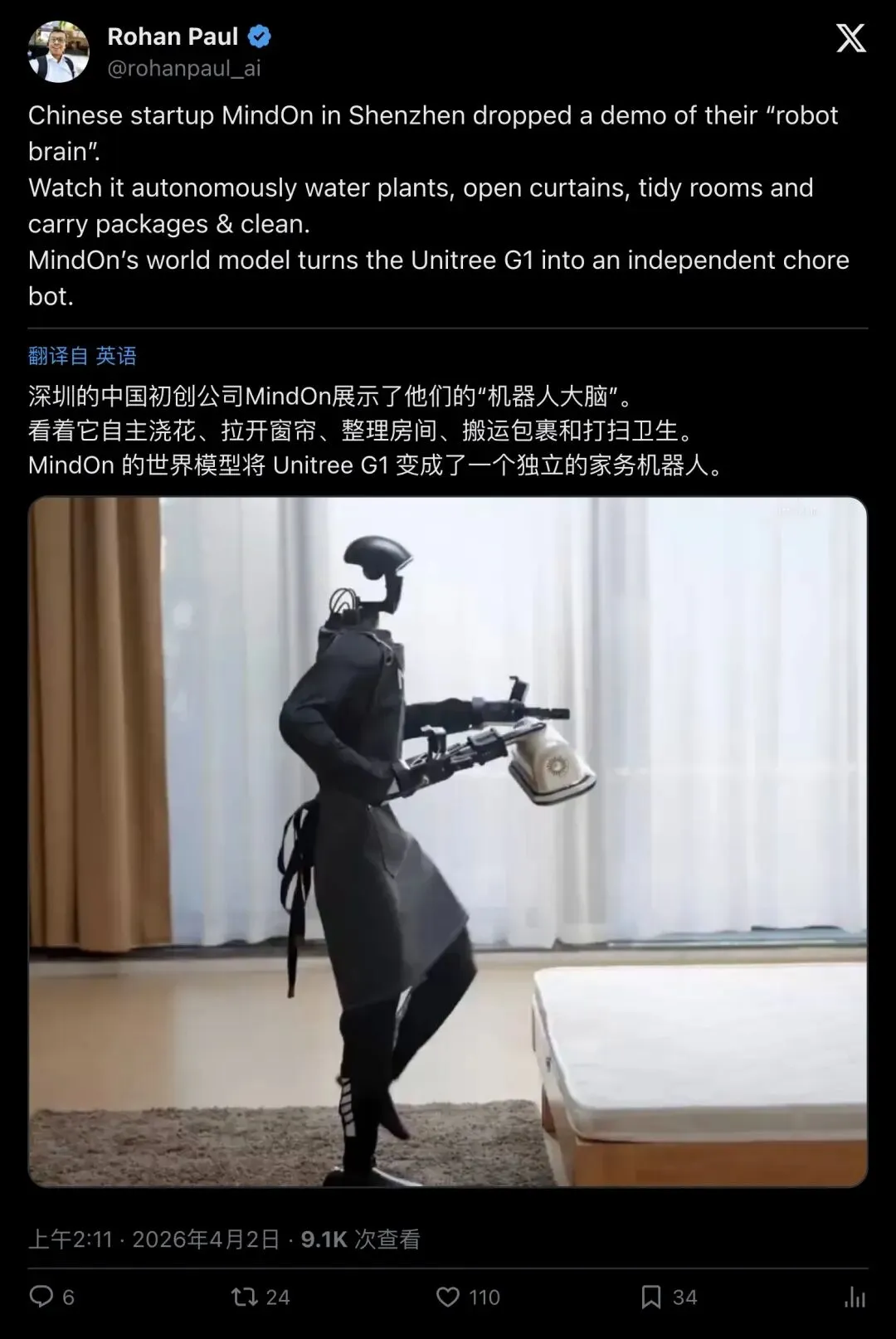 【导读】一段来自深圳初创公司 MindOn(灵启万物)的视频炸翻了整个机器人圈:一台售价仅 1.35 万美元起的 Unitree G1 人形机器人,在没有人类遥控的情况下,自主完成了浇花、拉窗帘、擦桌子、搬包裹、收拾玩具、倒垃圾等一系列家务。超 26 万人围观原帖,近 1200 人点赞,全网讨论至今未停。但争议也同样炸裂——这到底是真正的自主智能,还是又一场精心编排的"机器人表演秀"?一条视频,点燃了整个行业