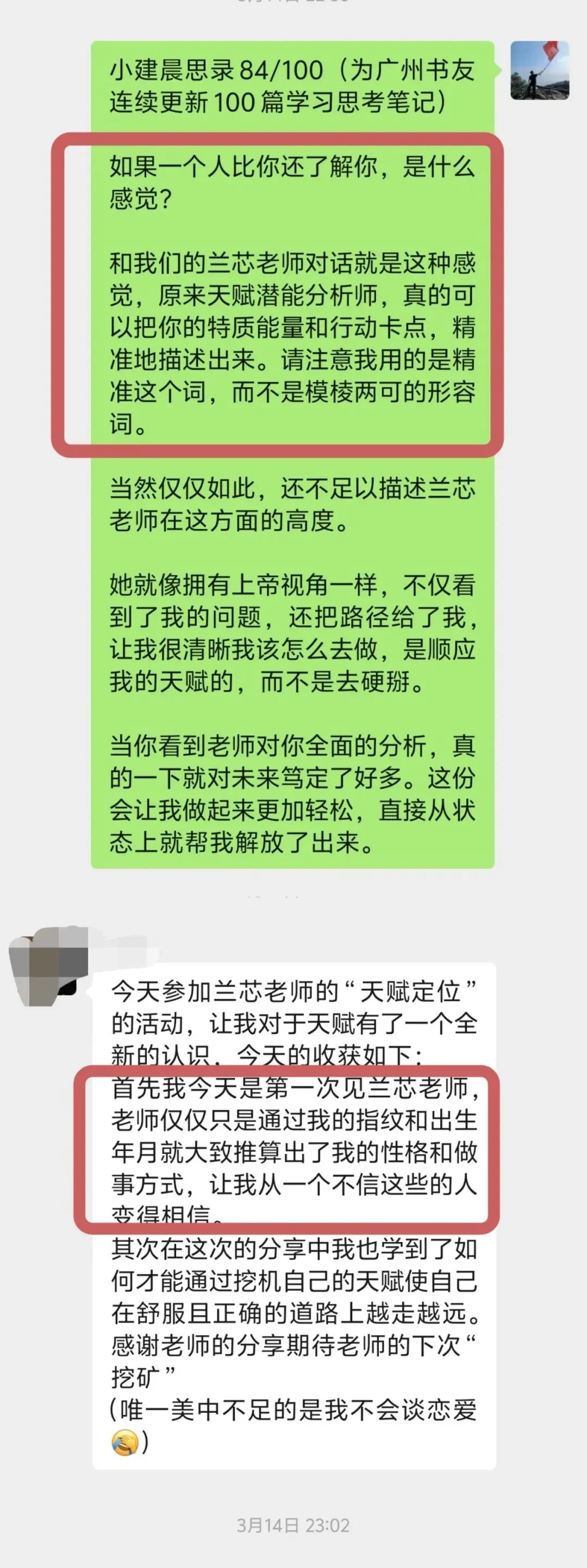 另一位书友分享:“今天最大的收获是,我终于明白为什么我做小红书总是不对劲,因为我一直在模仿别人,而我的天赋不允许我这么做。回去就重新定位。”
