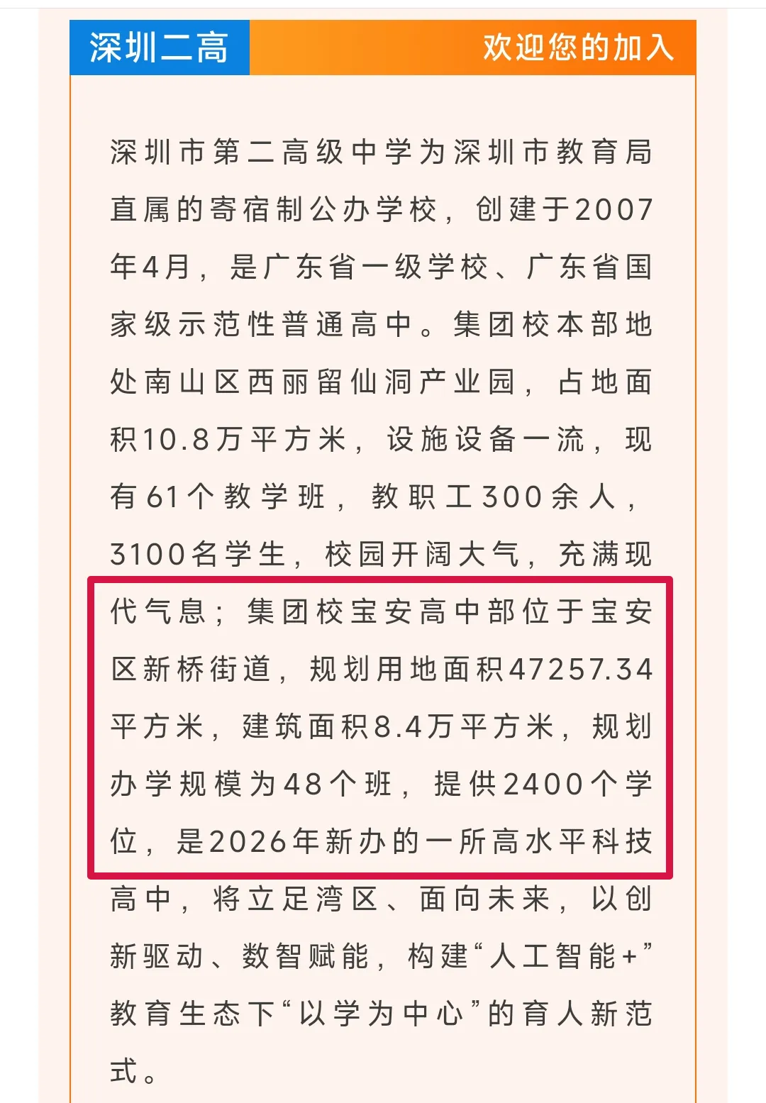 根据二高官网消息,集团今年新增深圳市第二高级中学宝安高中部。根据相关信息,二高宝安高中部就是正在建设中的深圳市第二十八高级中学。文中附二高宝安高中部招生QQ群,感兴趣的学生家长可进群了解最新消息!