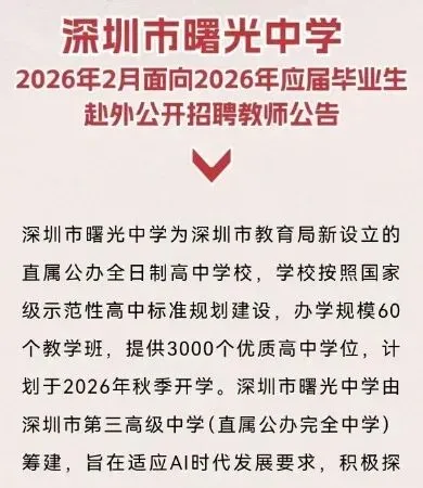 深圳市曙光中学为深圳市教育局新设立的直属公办全日制高中学校,按照国家级示范性高中标准规划建设,办学规模60个教学班,提供3000个优质高中学位,计划于2026年秋季开学【首届应该也是借校办学】。