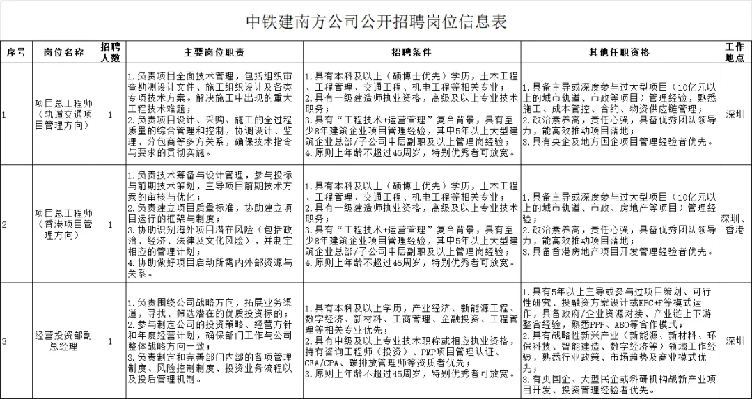 详见《中铁建南方公司公开招聘岗位信息表》(附件1)