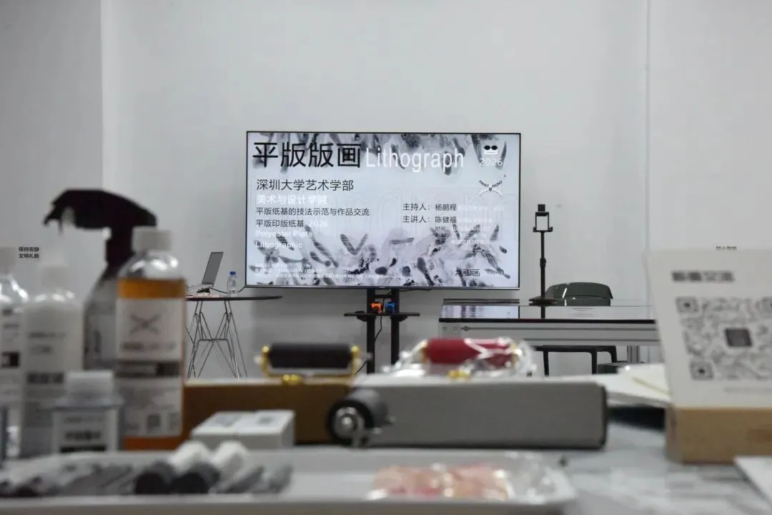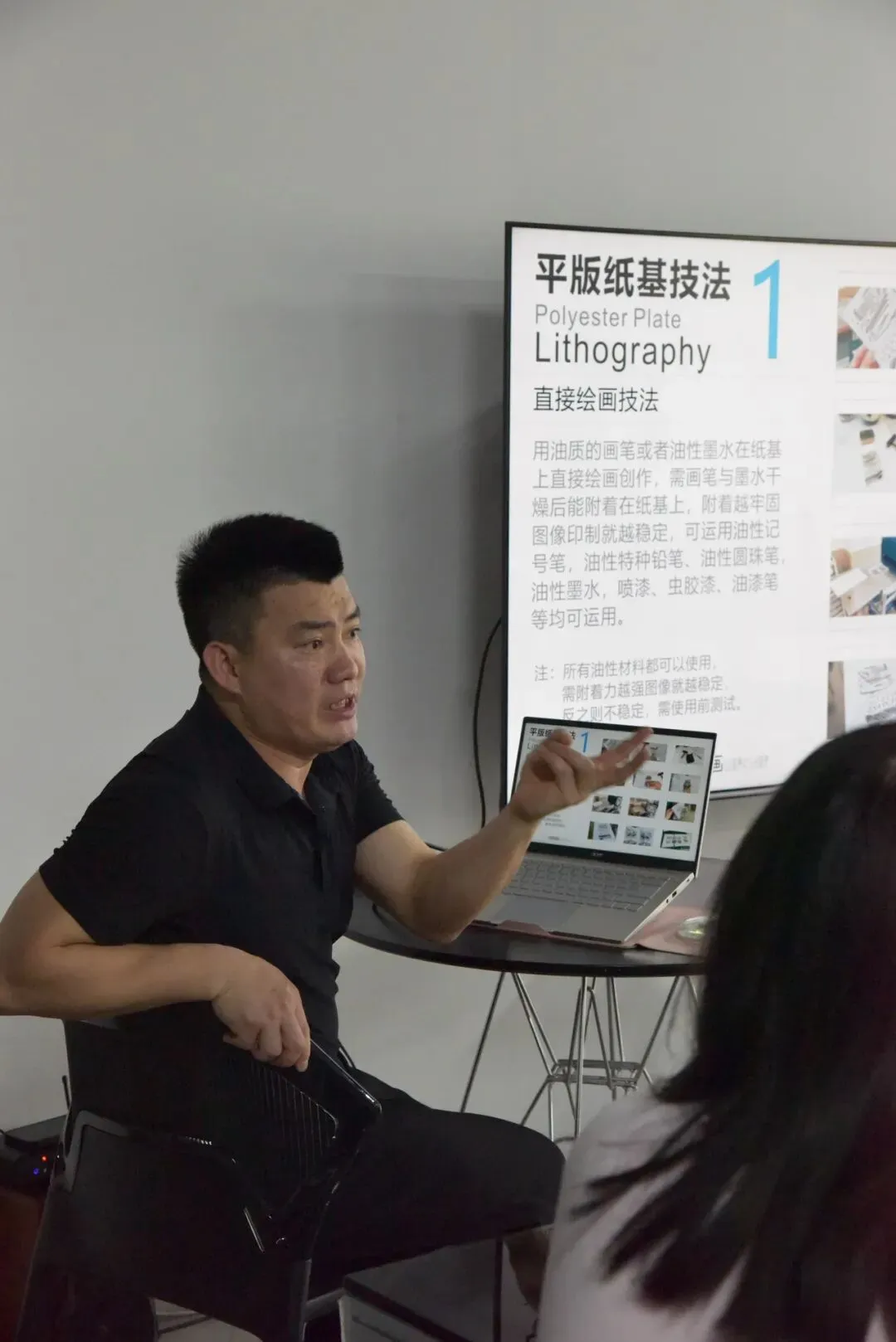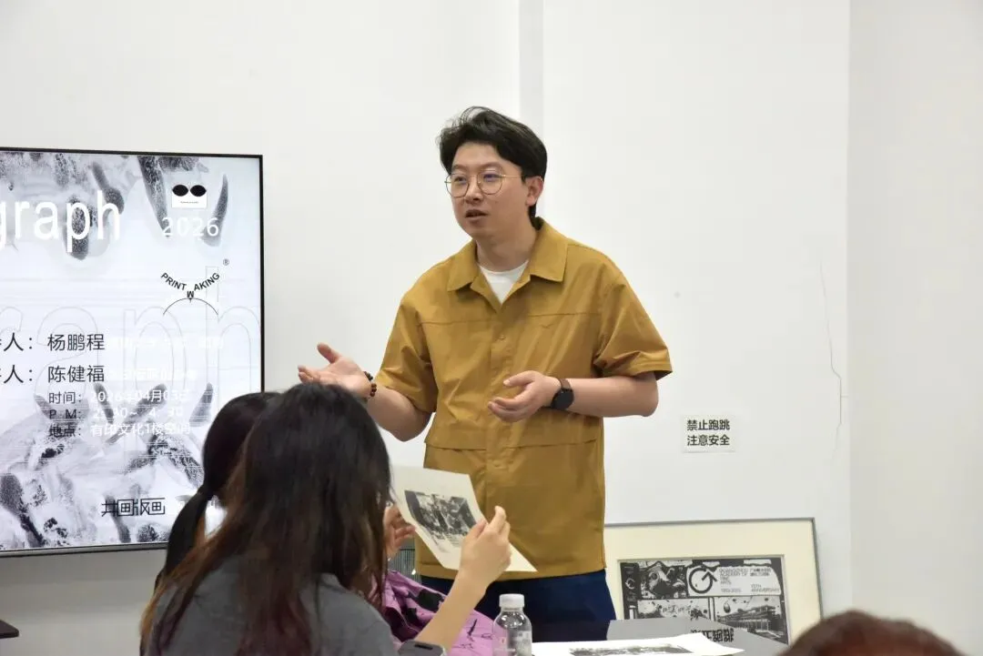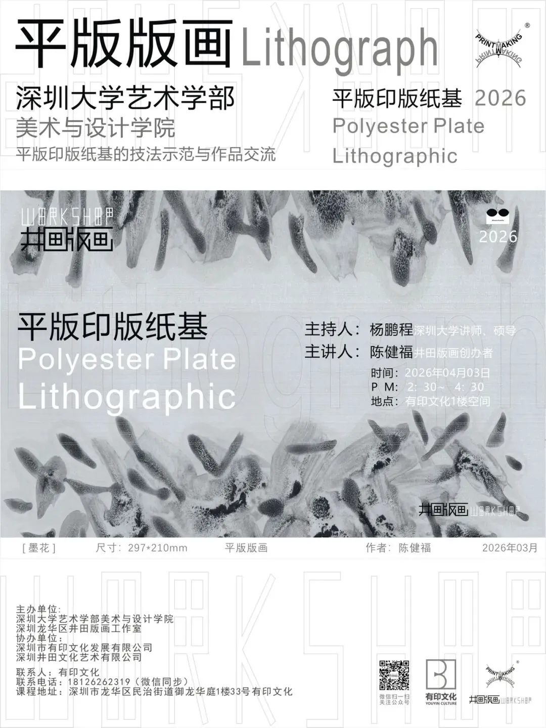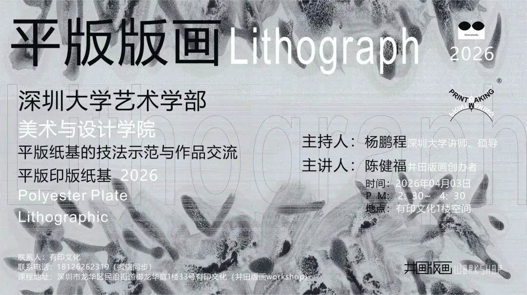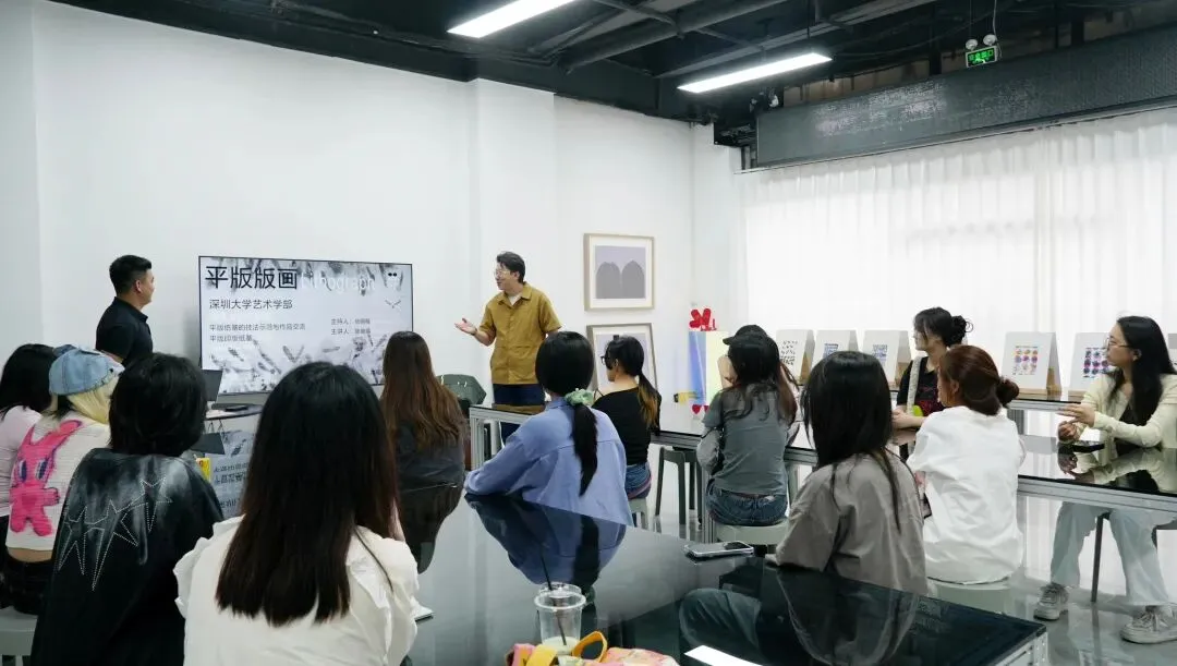 2026年4月3日下午,井田版画workshop迎接深圳大学艺术学部美术与设计学院的杨鹏程老师跟学生们,在有印文化一楼空间进行一次平版版画的课程介绍,展示了平版印版纸基的技法示范、平版版画的作品交流,让同学们对平版版画的基础知识有初步了解,对平版版画工具、材料的使用以及制作过程有更深刻的感受,为同学们后续创作平版版画作品做准备。