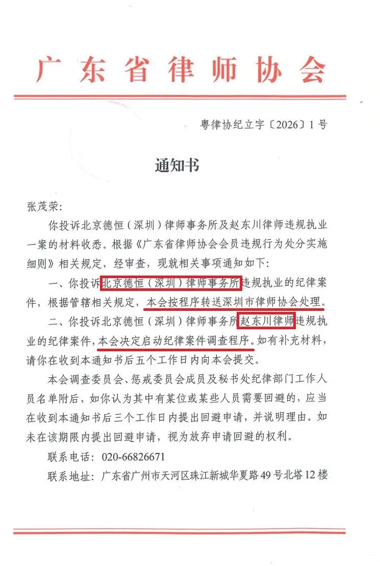 二、投诉赵东川律师违规执业案,广东律协启动调查程序。