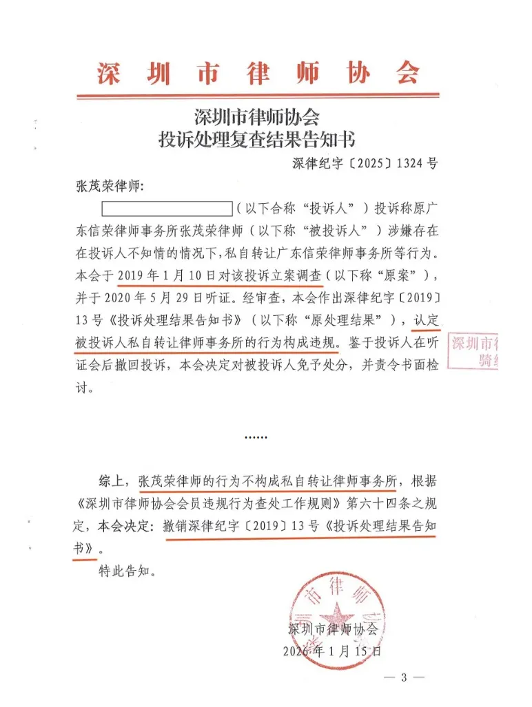 2026年1月26日(被恶意投诉7年、错误认定违规5年之后),深圳律协终于复查并给笔者出具了《投诉处理复查结果告知书》,确认笔者不构成违规,撤销2021年认定笔者违规的调查结论。