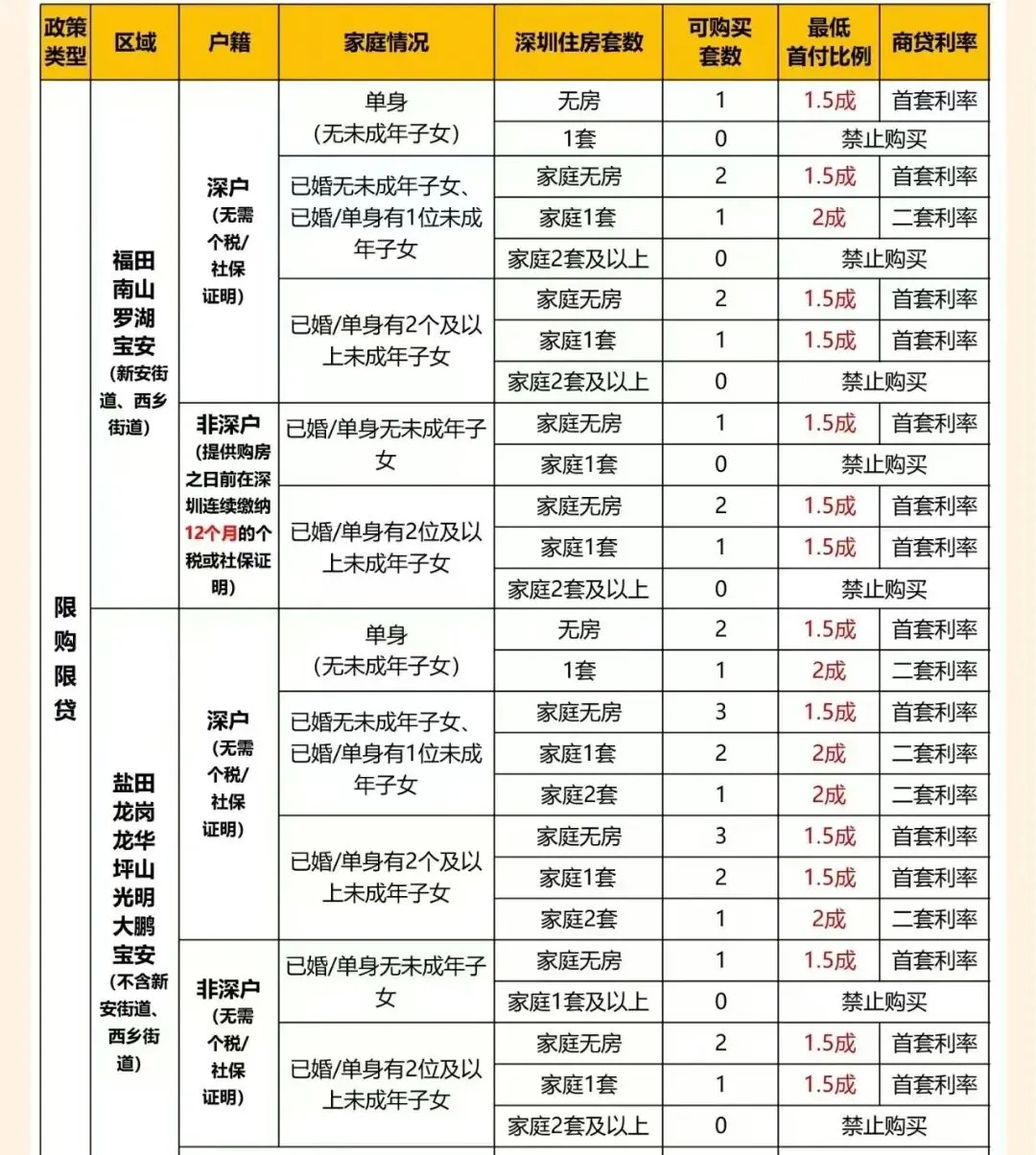 | | 深户限购 2套;非深户需连续1年社保/个税,限购1套 |