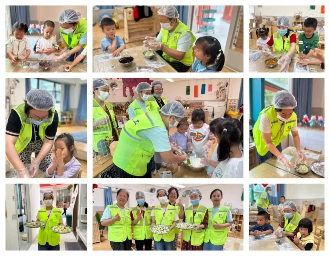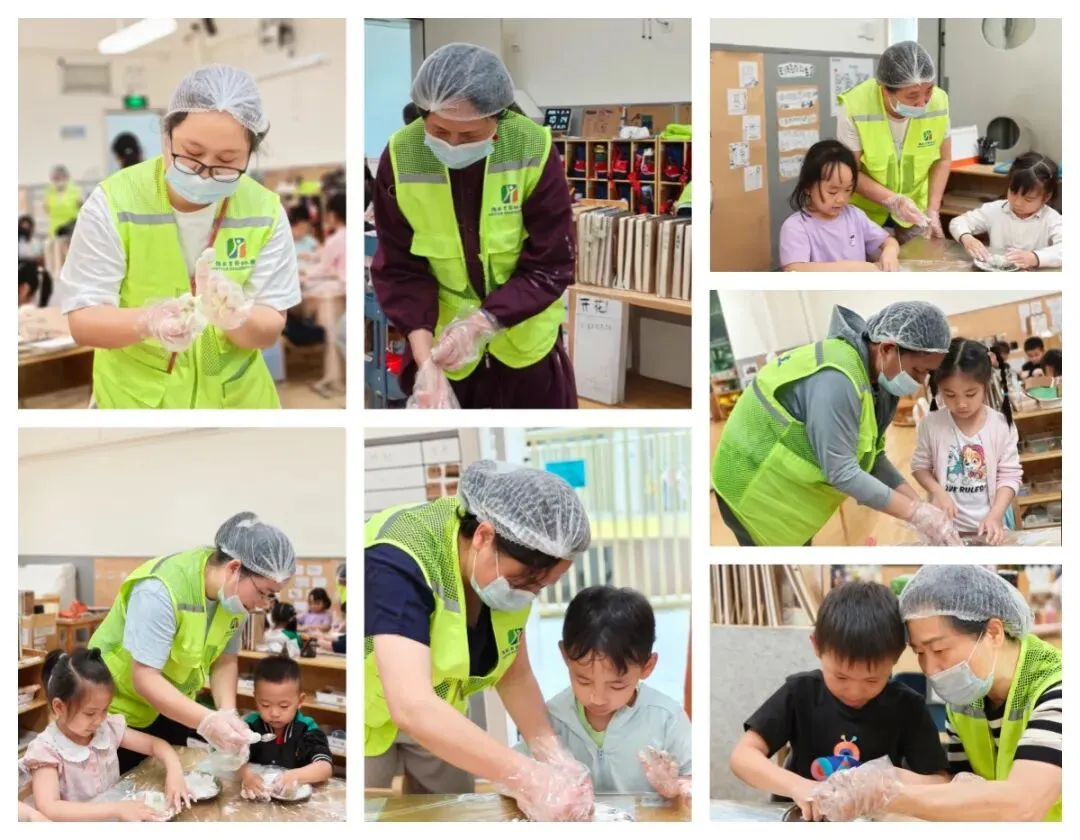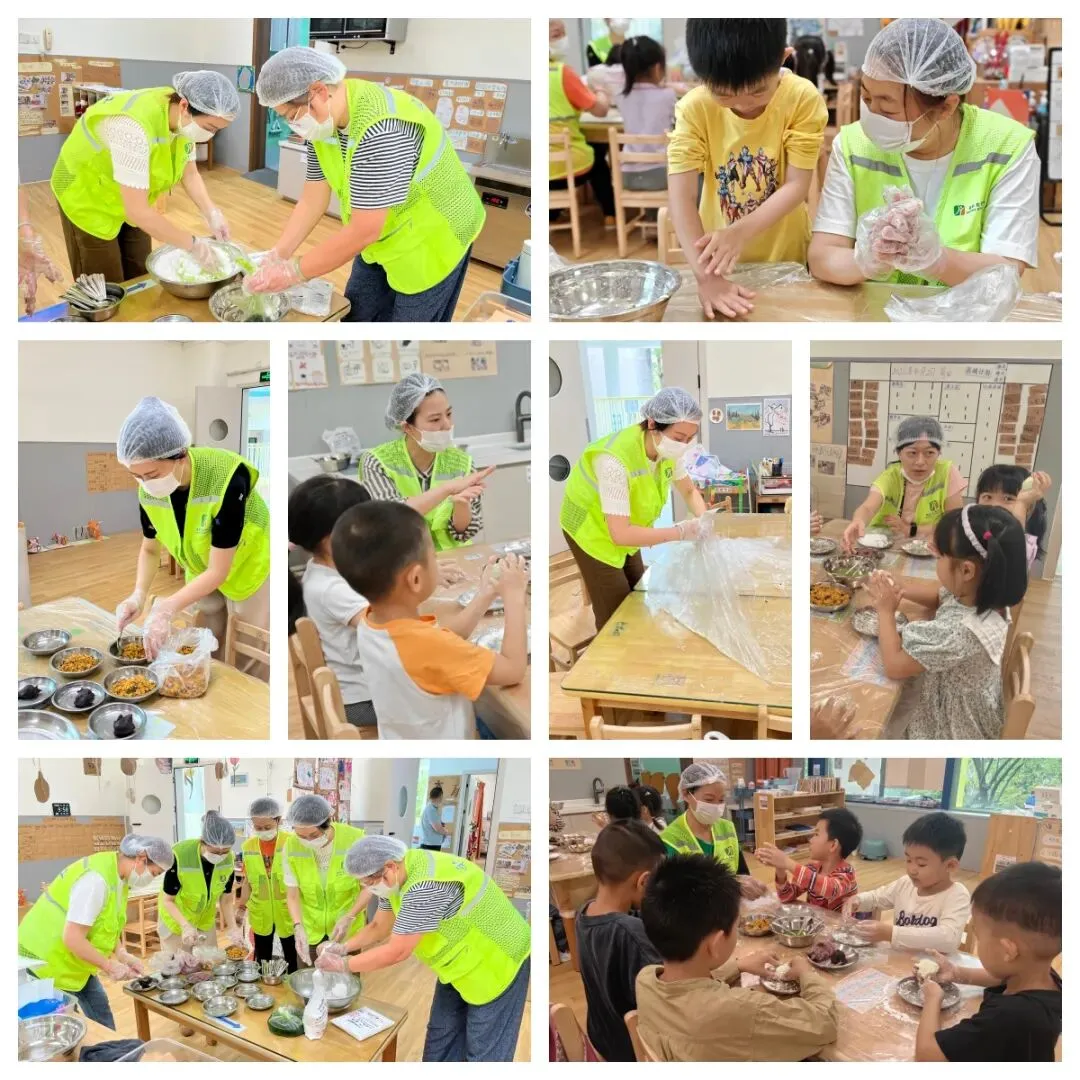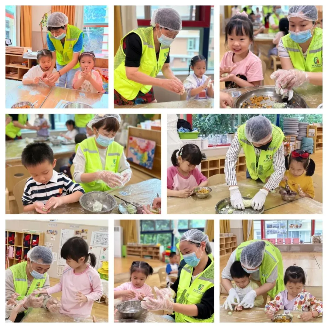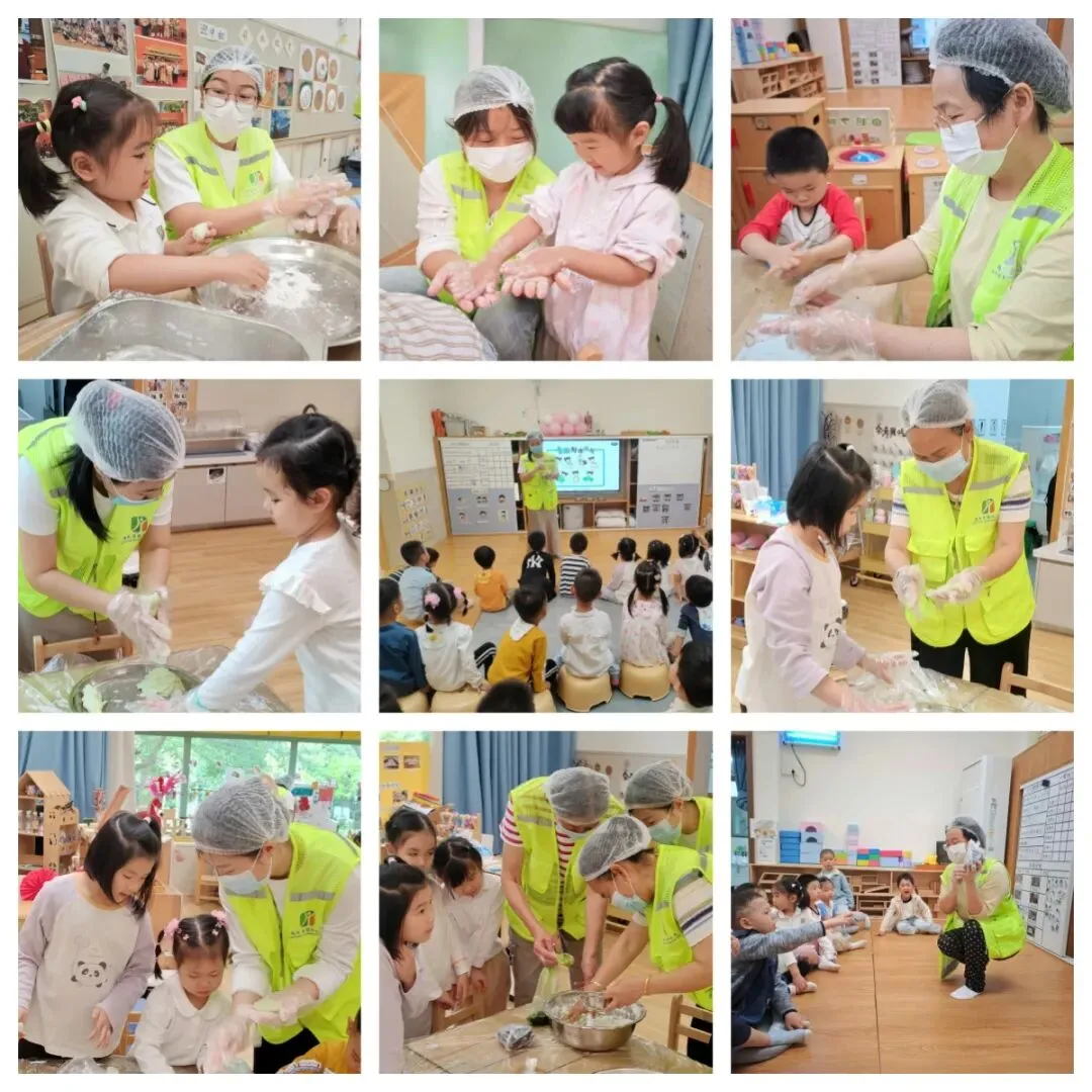 身穿绿马甲的家长助教走进班级,和孩子们一起揉春色、包甜蜜,在指尖传承清明味道。