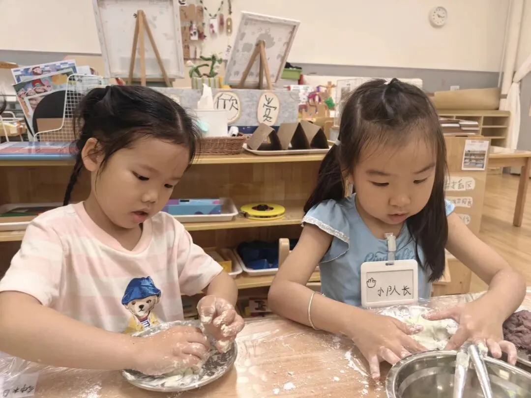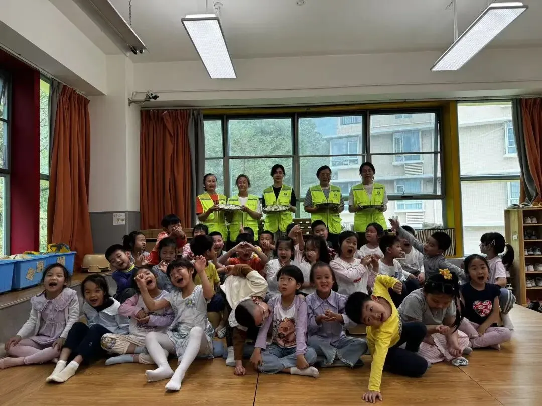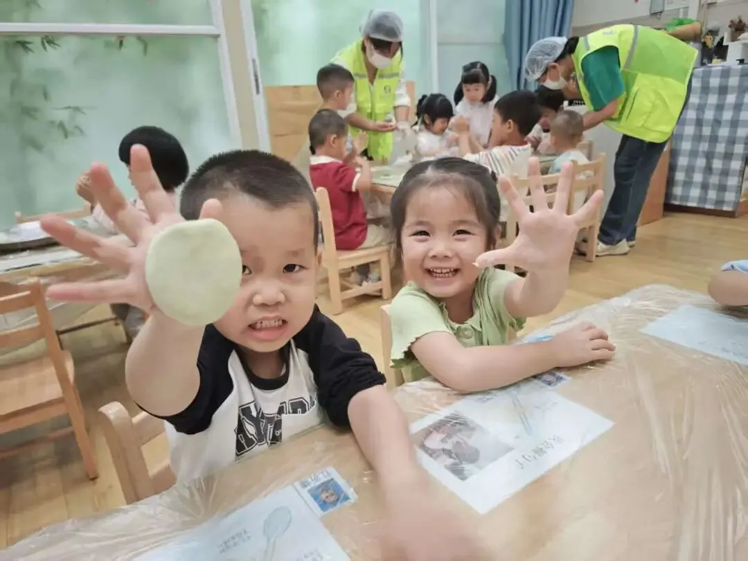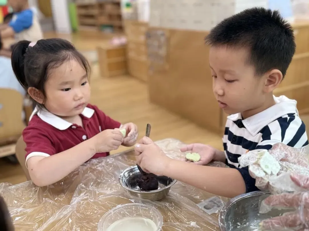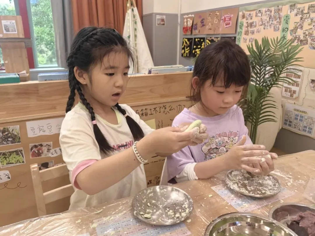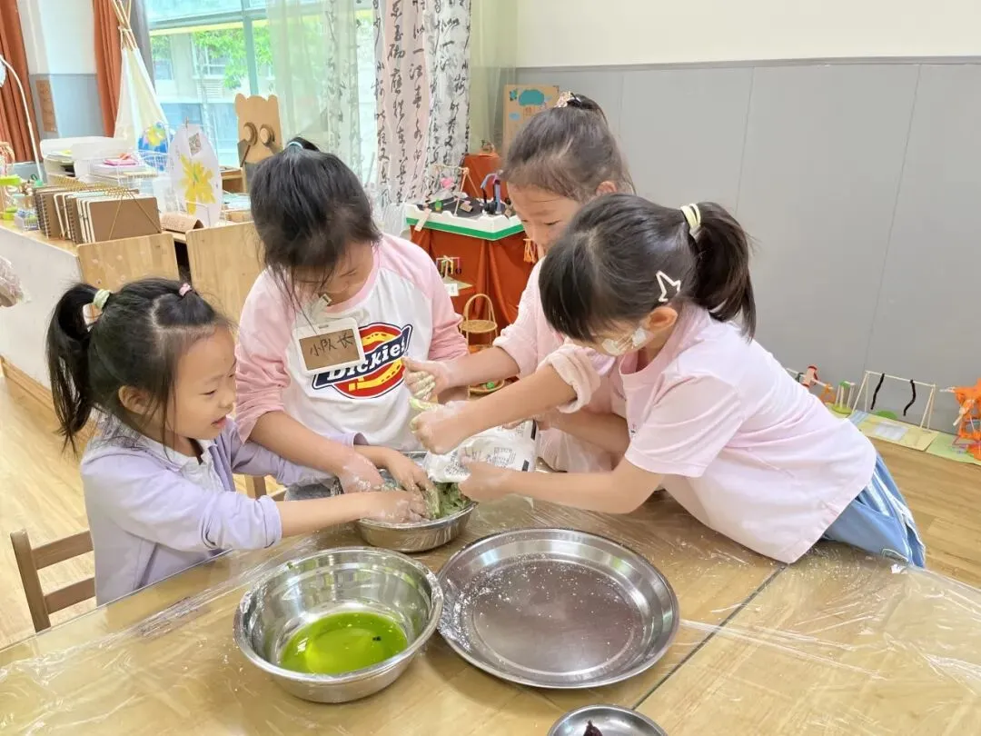 身穿绿马甲的家长助教走进班级,和孩子们一起揉春色、包甜蜜,在指尖传承清明味道。