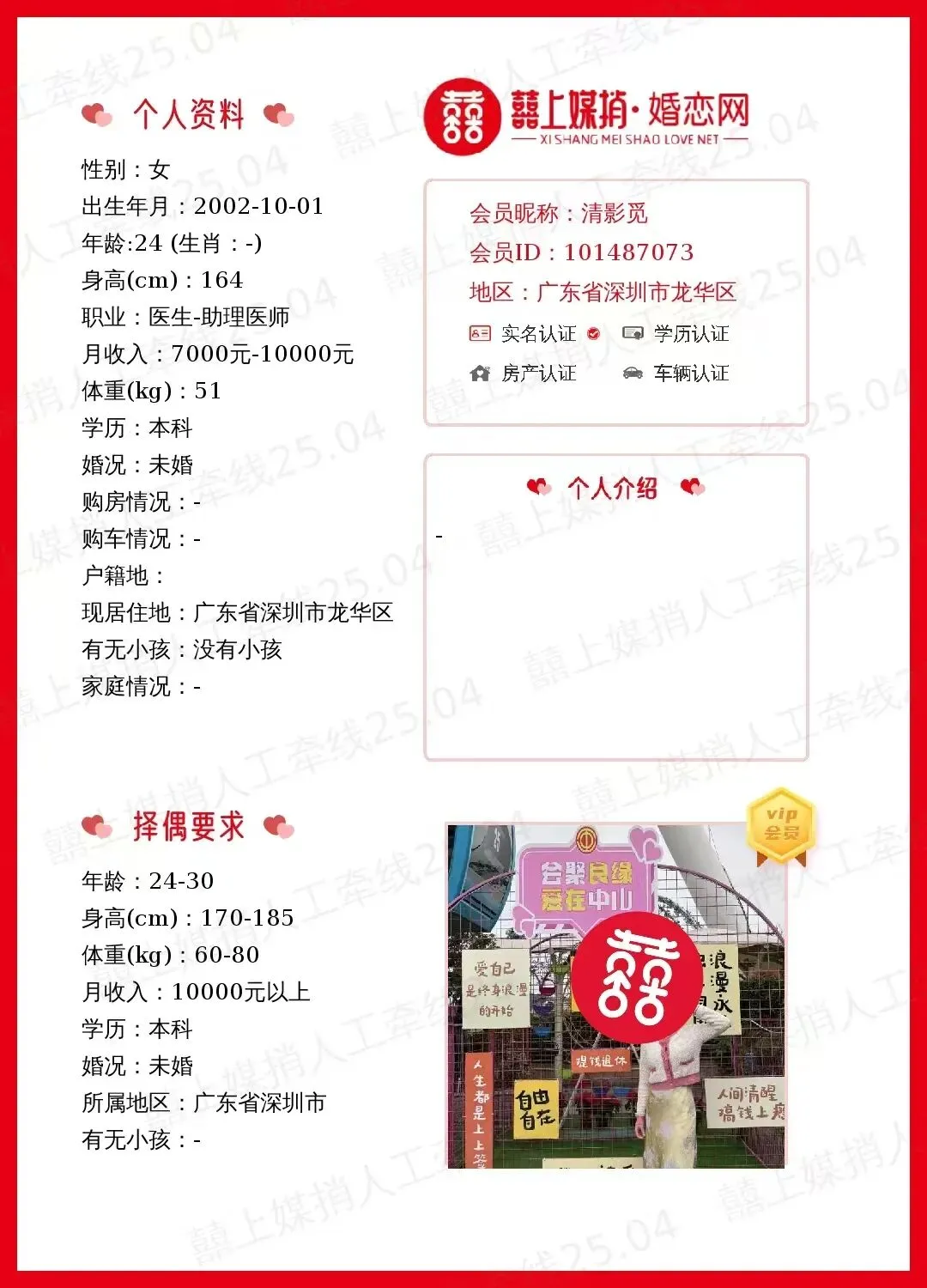 本平台推荐的嘉宾,均通过人工审核信息,确保身份、学历、不动产等证照资质真实(为保护个人隐私,部分内容不方便太细化展示,详细情况请联系客服了解。)