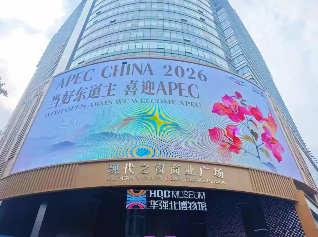 从城市主干道的核心楼宇,到华强北商圈的现代之窗商业广场、华强北博物馆,深圳全城多处户外电子显示屏,已同步滚动播放APEC主题宣传海报。