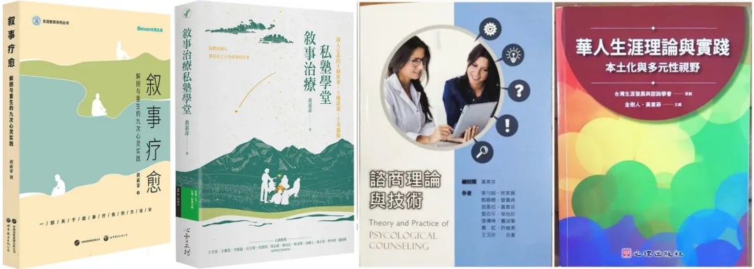 黄素菲老师才华横溢,著作颇丰,著有《叙事疗愈》《叙事治疗私塾学堂》《华人生涯理论与实践:本土化与多元化视野》《咨商理论与技术》《叙事治疗的精神与实践》《生涯辅导(高中教科书)》等十余本叙事治疗、生涯谘商领域专著专著;译有《叙事治疗三幕剧:结合实务、训练与研究》《叙事取向的生涯谘商》《人际沟通》等。
