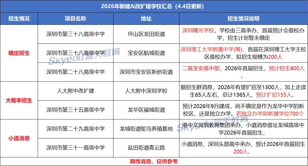 考生激增的环境下,除了现有的高中学位,新高中的建设也时刻被初三家长们关注着~此前网传深圳2026年预计新增6所新高中,并且还有改扩建学位增加