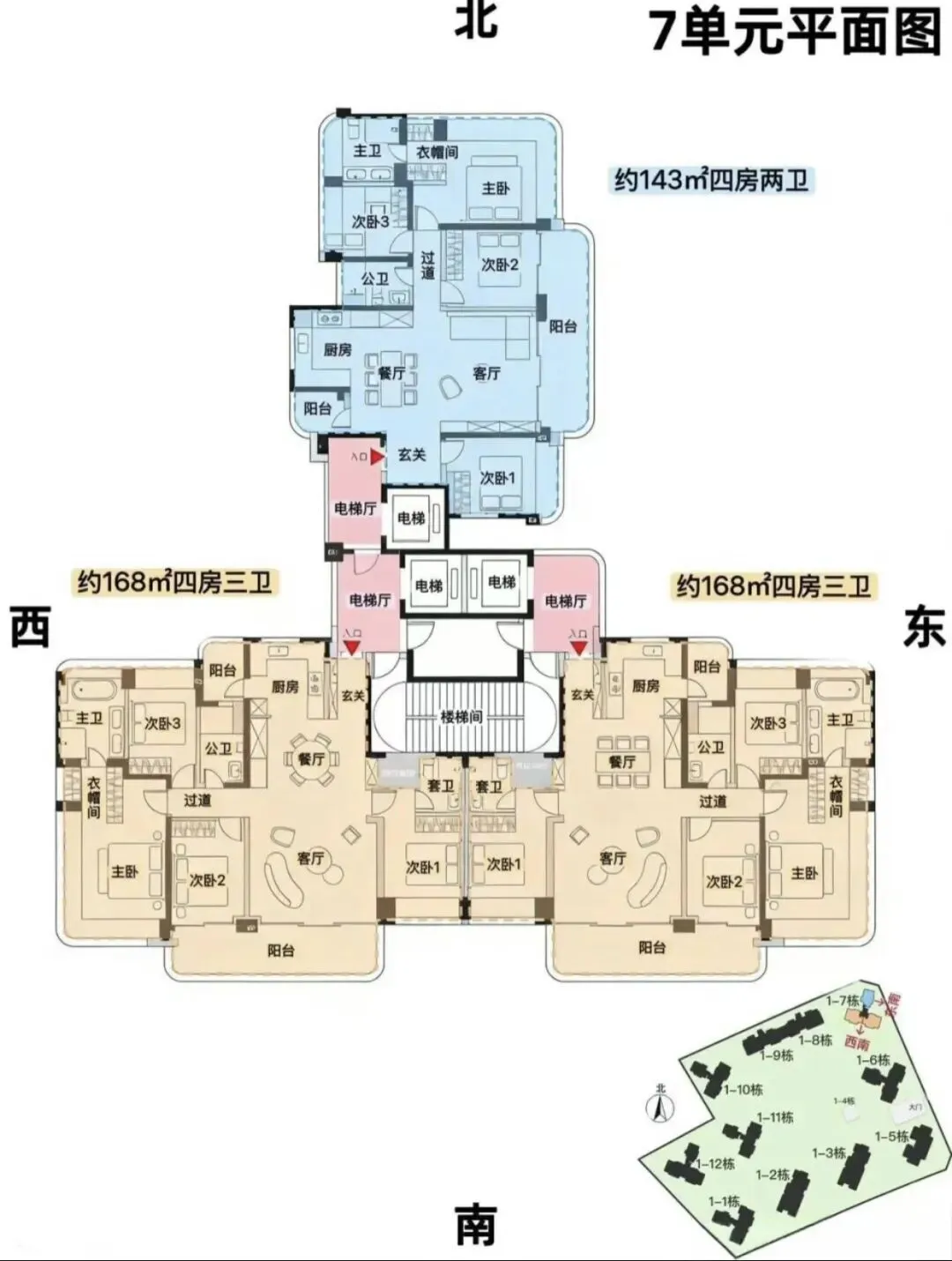 主要为2梯2户、3梯3户的户型。如果按目前规划的层数梯户比算是657套房源,因为正常现在都有架空层不确定2层还是3层起算首层,所以最终户数可能有点小差距,以实际公布为准,车位地上271+地下934个一共1205个,如果最终是2-3层为首层车位比应该能达到1:2以上