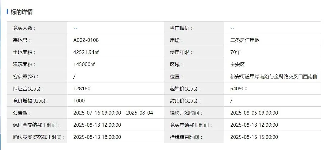 7月16日,深圳公共资源交易中心挂牌一宗新宅地,宗地号A002-0108,地块位于新安街道甲岸南路与金科路交叉口西南侧。