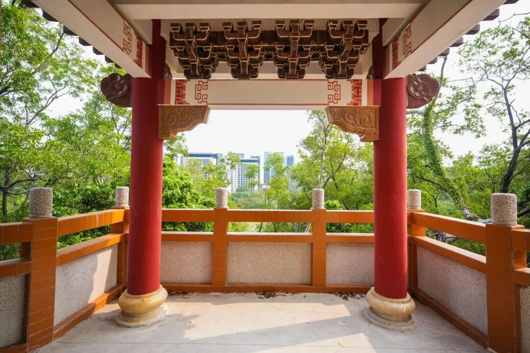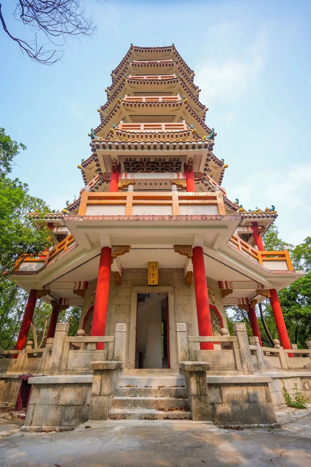 西丽塔塔身采用八角飞檐琉璃瓦设计,斗拱层叠、檐角微翘,塔内画栋雕梁,古色古香,塔座平台以花岗岩铺砌,琉璃瓦当在阳光下熠熠生辉。历经四十余年风雨,这座地标建筑仍独具韵味。