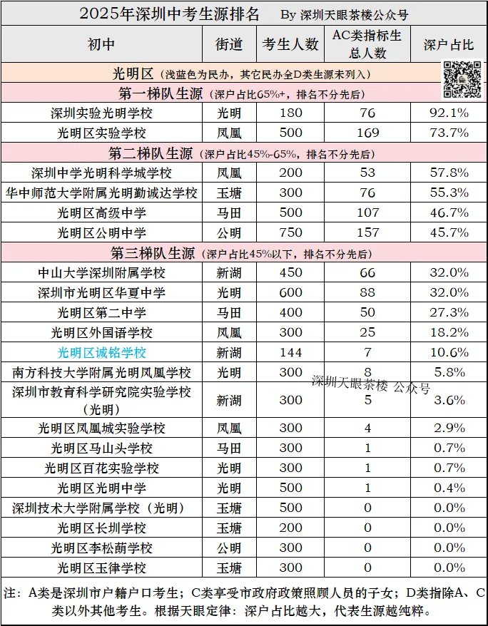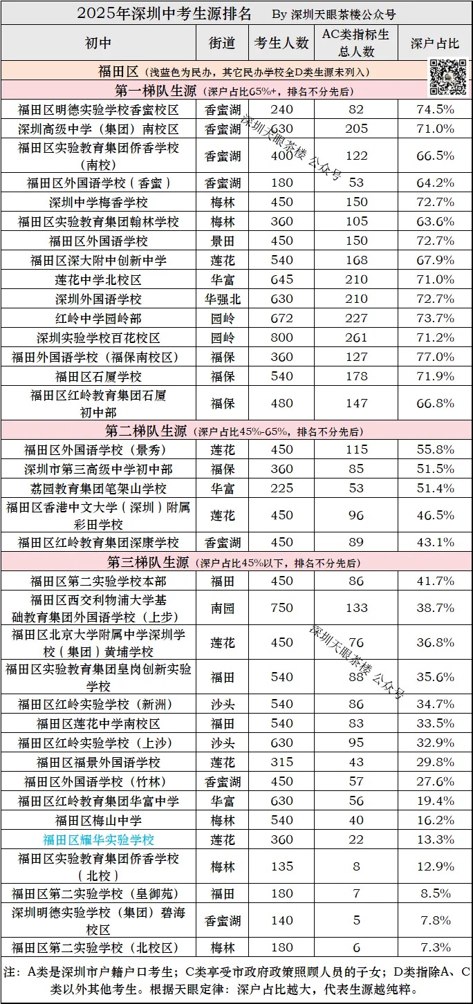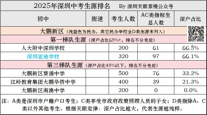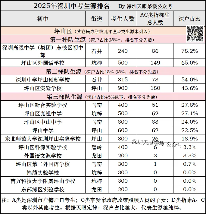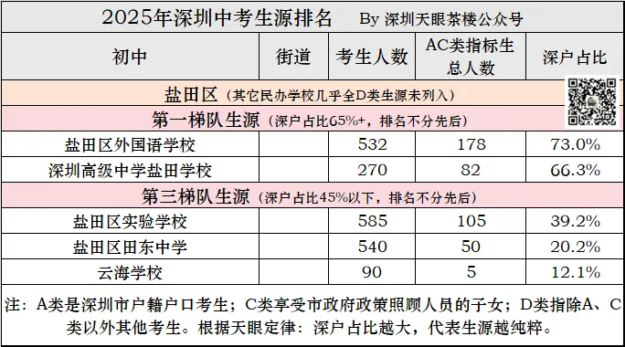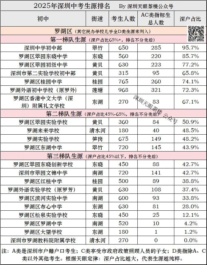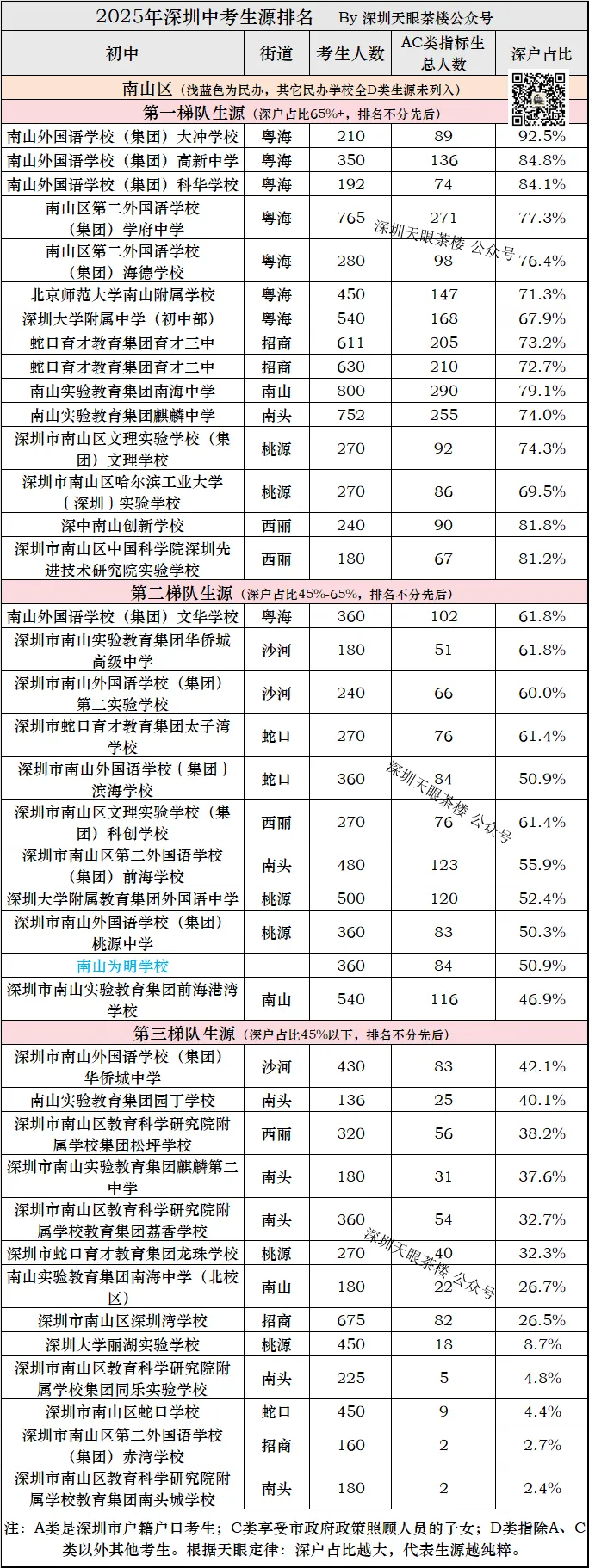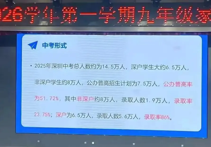 深圳2025年中考,14.5万考生,深户约6.5万人,占比45%,这意味着第二梯队以上都超过了平均水平,第三梯队低于全市平均水平。