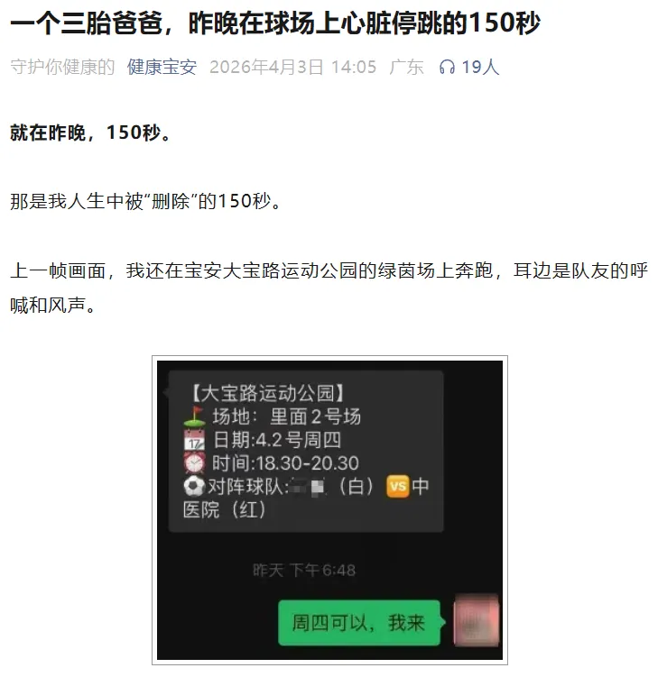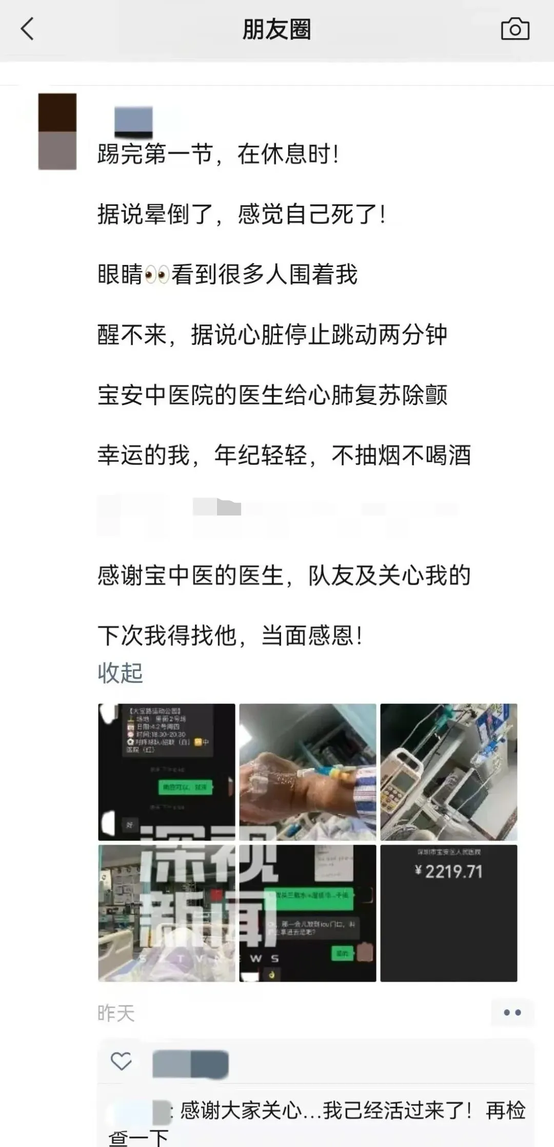 但对于深圳宝安的一位三胎爸爸王先生(化名)来说,是他人生中被强制“删除”的黑屏时刻,也是他在鬼门关前走了一遭,被一群“神仙球友”硬生生拽回人间的奇迹。从王先生的自述中,一个不抽烟、不喝酒、甚至还会练养生操的普通老师,还原了心脏骤停那一刻的“死亡视角”。